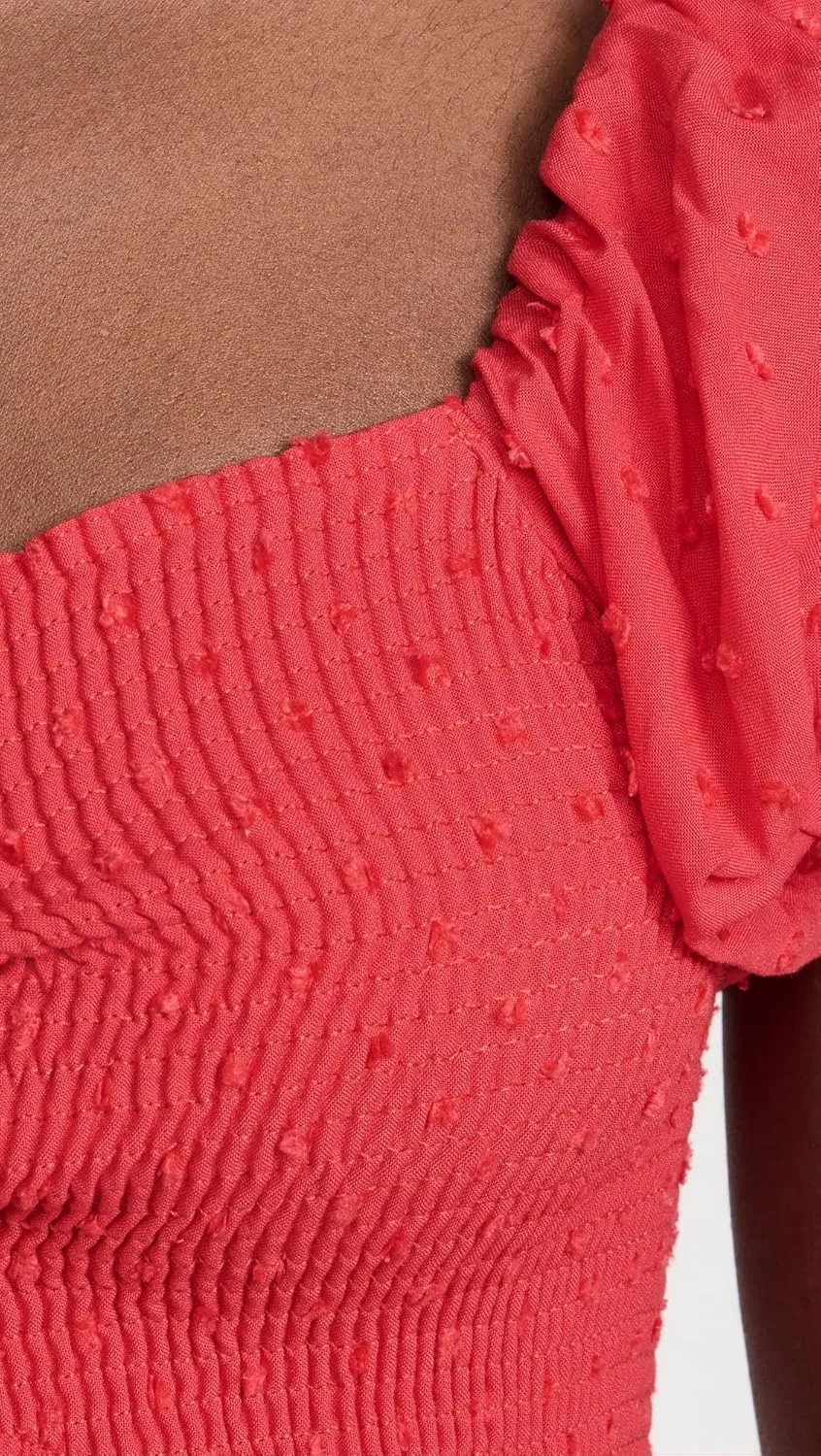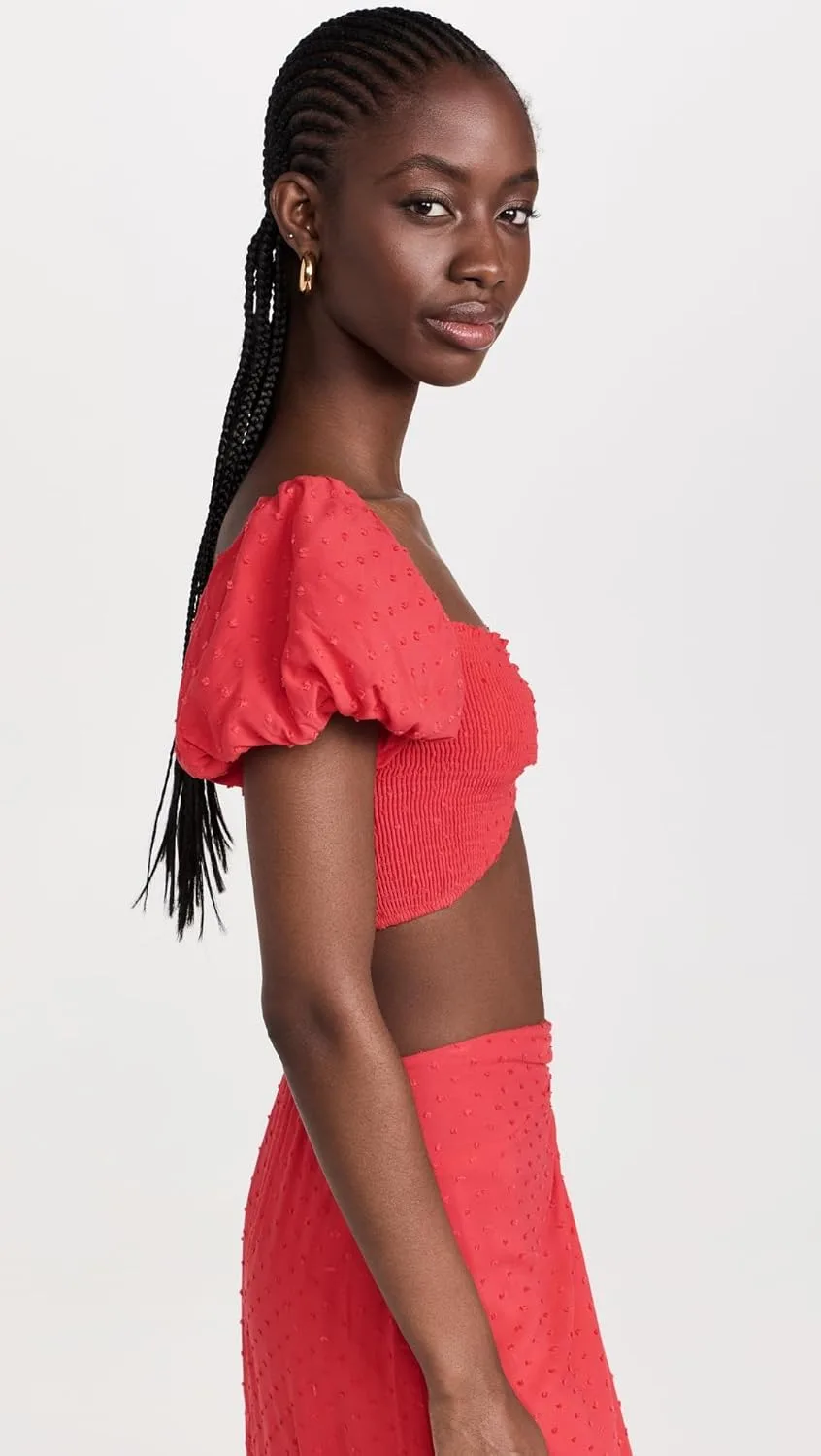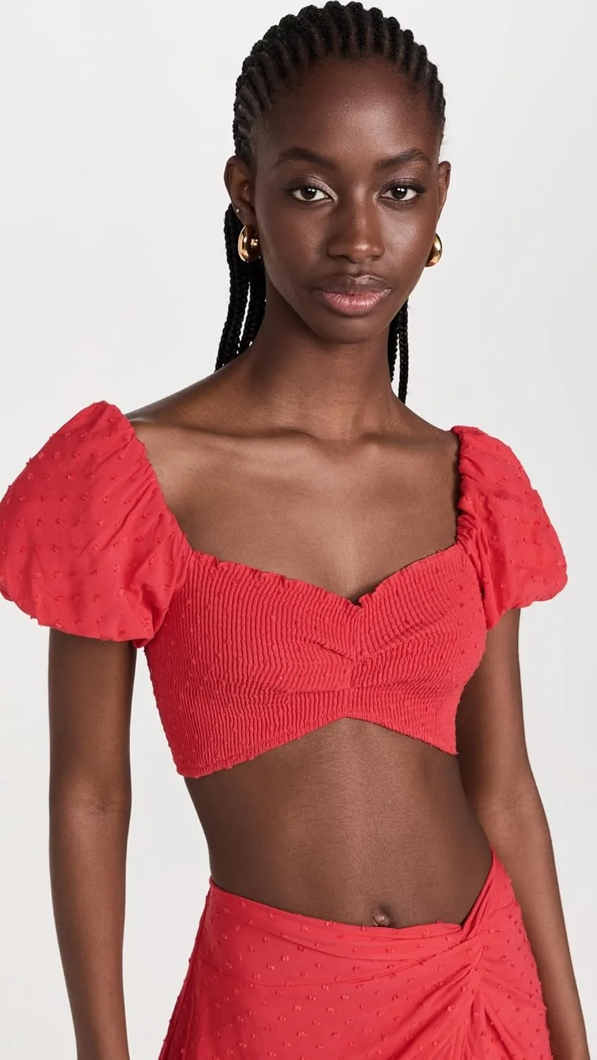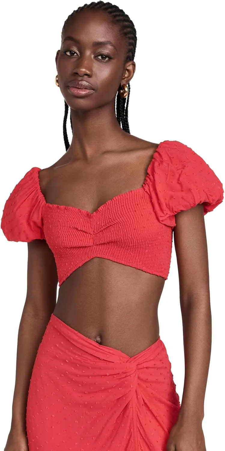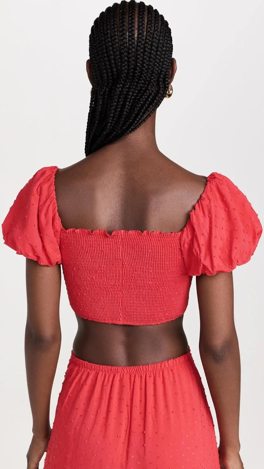 Короткие рукава-фонарики с эластичными манжетами, присборенный эластичный лиф, укороченный силуэт.