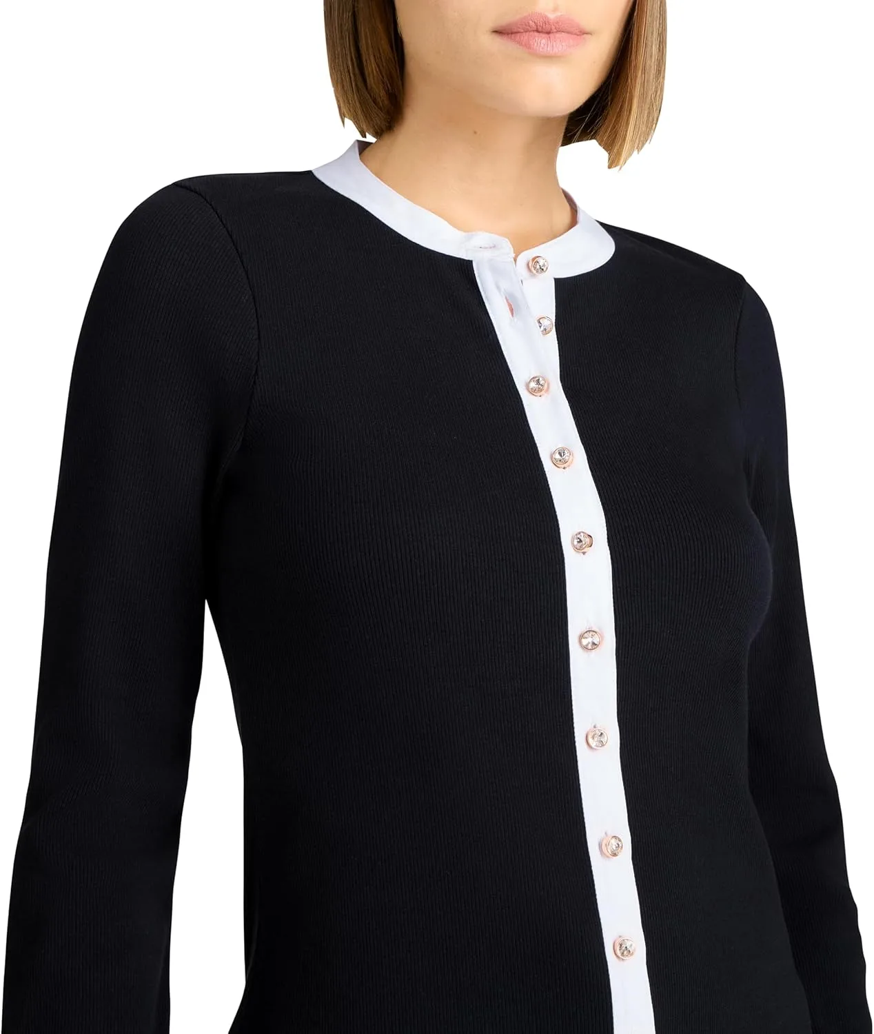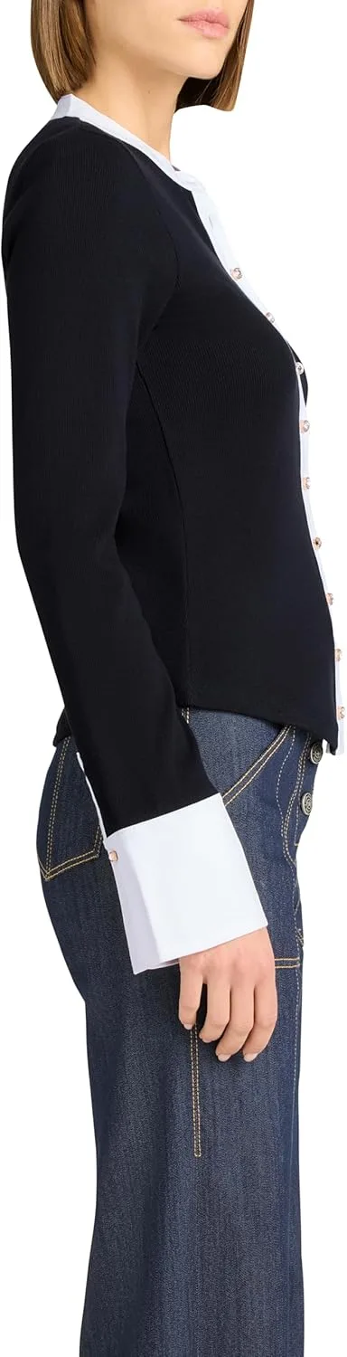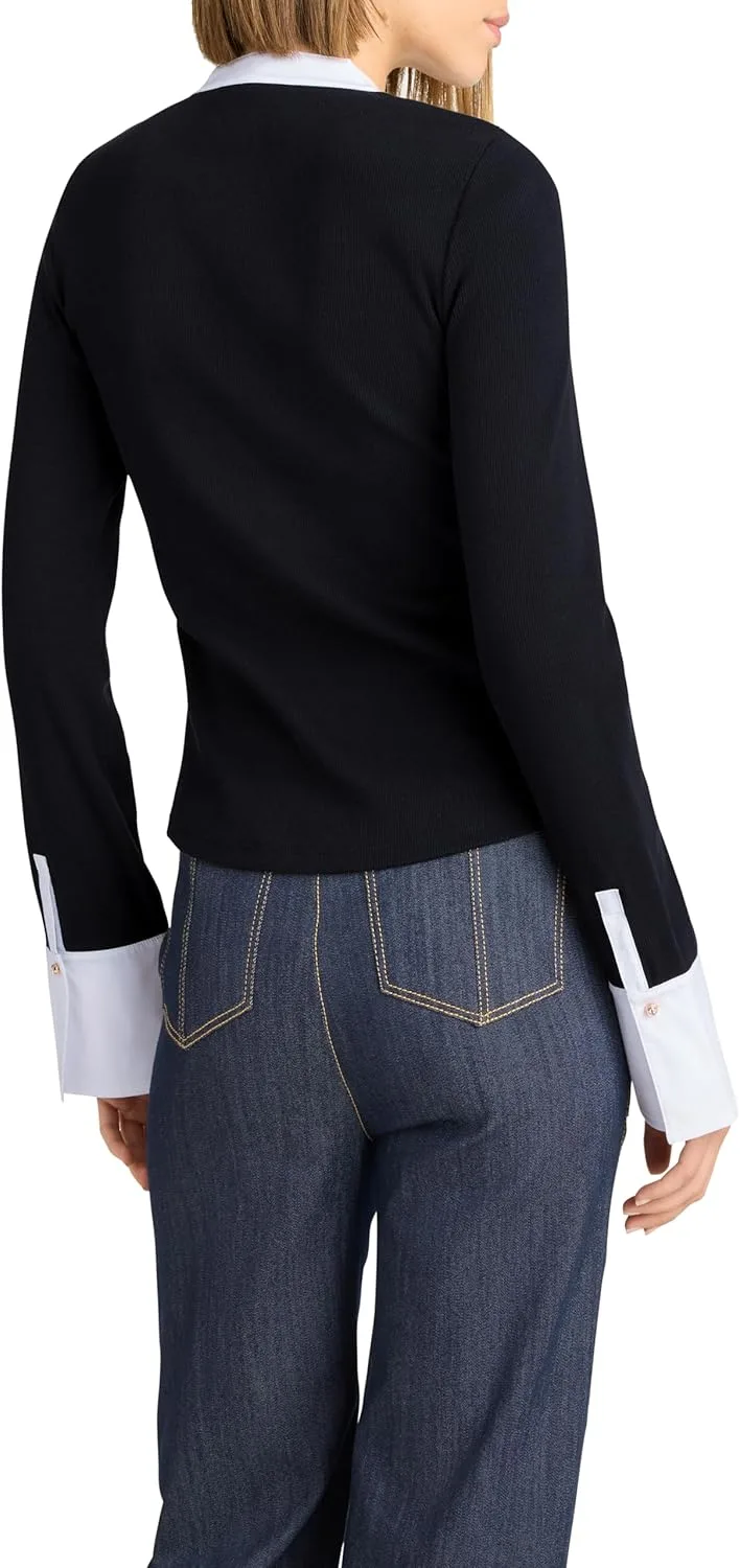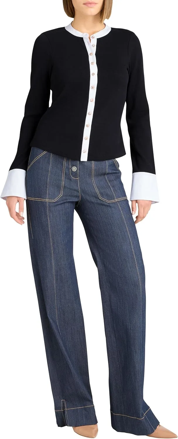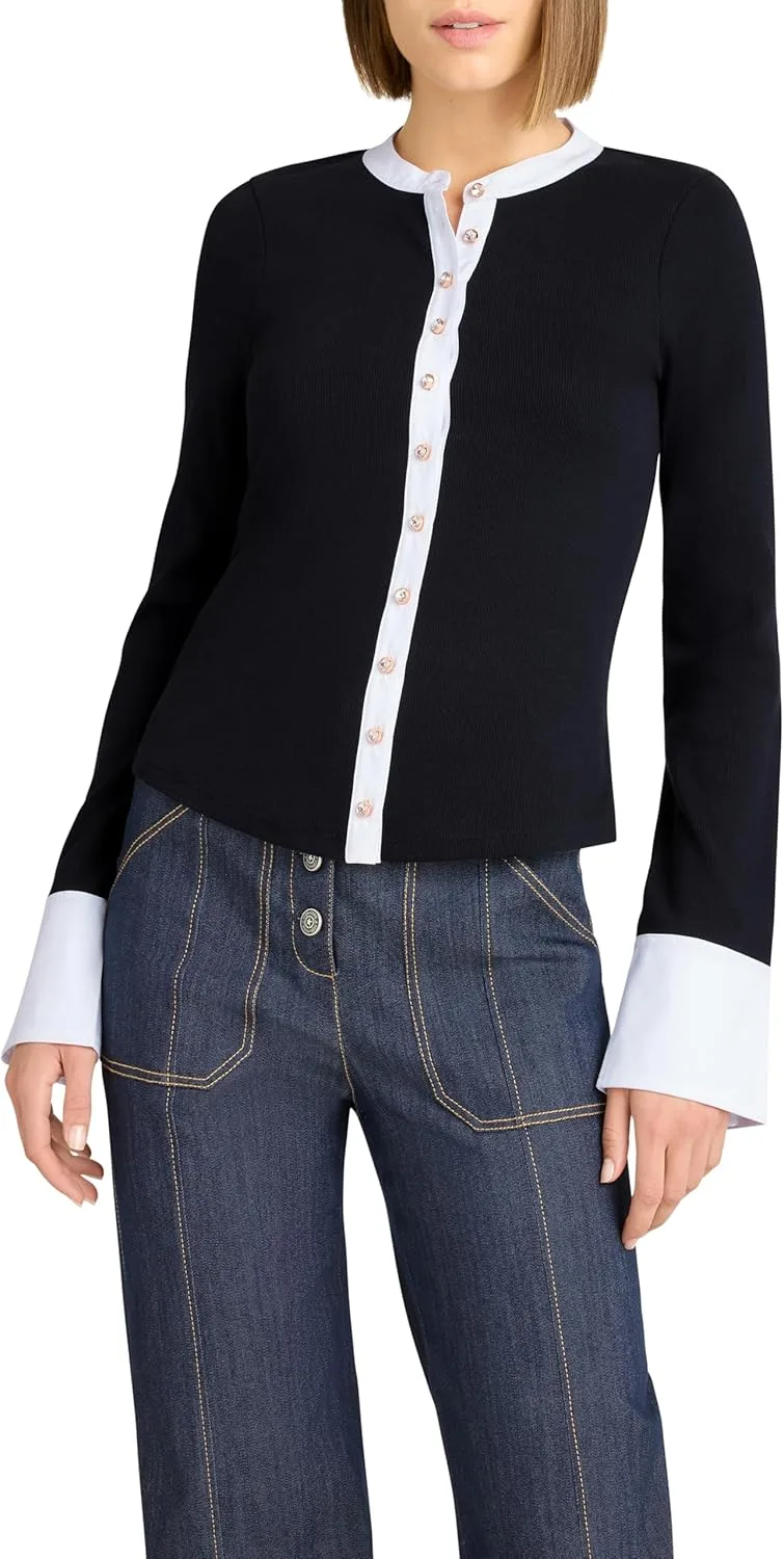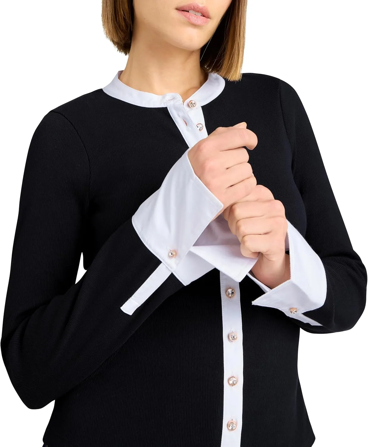 Круглый вырез горловины, длинные рукава, манжеты на пуговицах, застежка на пуговицы спереди, хлопок.