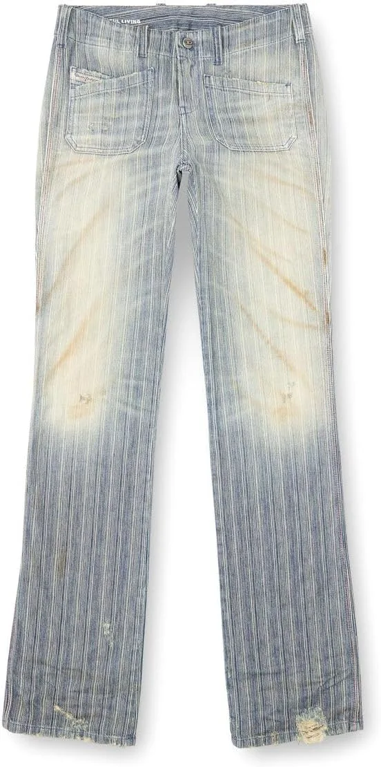 Брюки прямого кроя с низкой посадкой и зауженными штанинами, отличающиеся накладными карманами спереди. Застежка на пуговицы. Этот джинсовый материал отличается особым переплетением белых и индиговых нитей, создающих нерегулярный полосатый узор. Разная ширина полос добавляет изюминку, а обработка под камень и ручная шлифовка придают изделию тактильный, поношенный вид. Тщательно продуманные эффекты загрязнения и потертости, выполненные вручную, придают изделию глубину и насыщенность цвета.