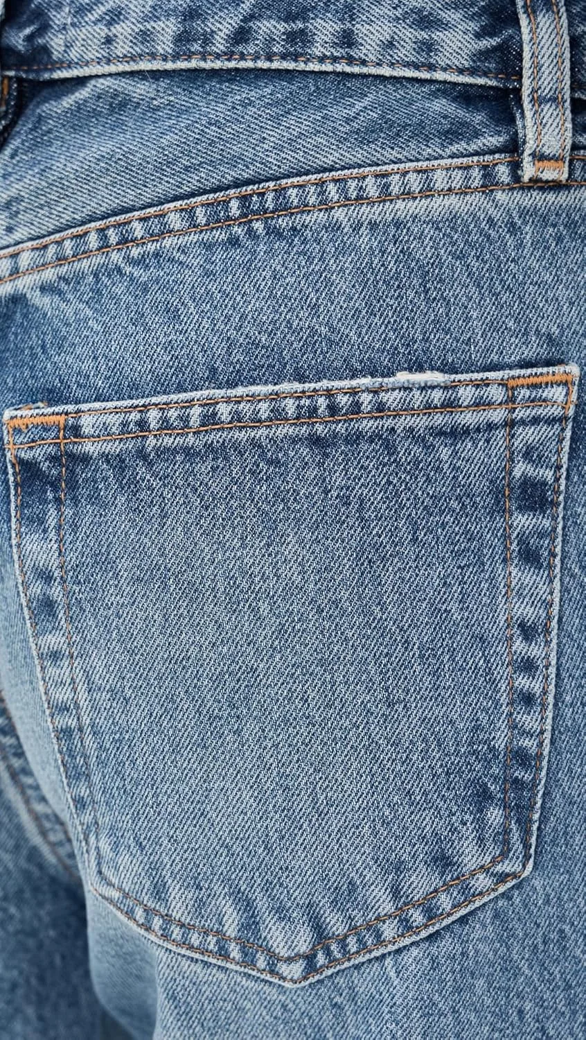 Контрастная строчка, эффект потертости и выцветания, необработанный край и потертости.