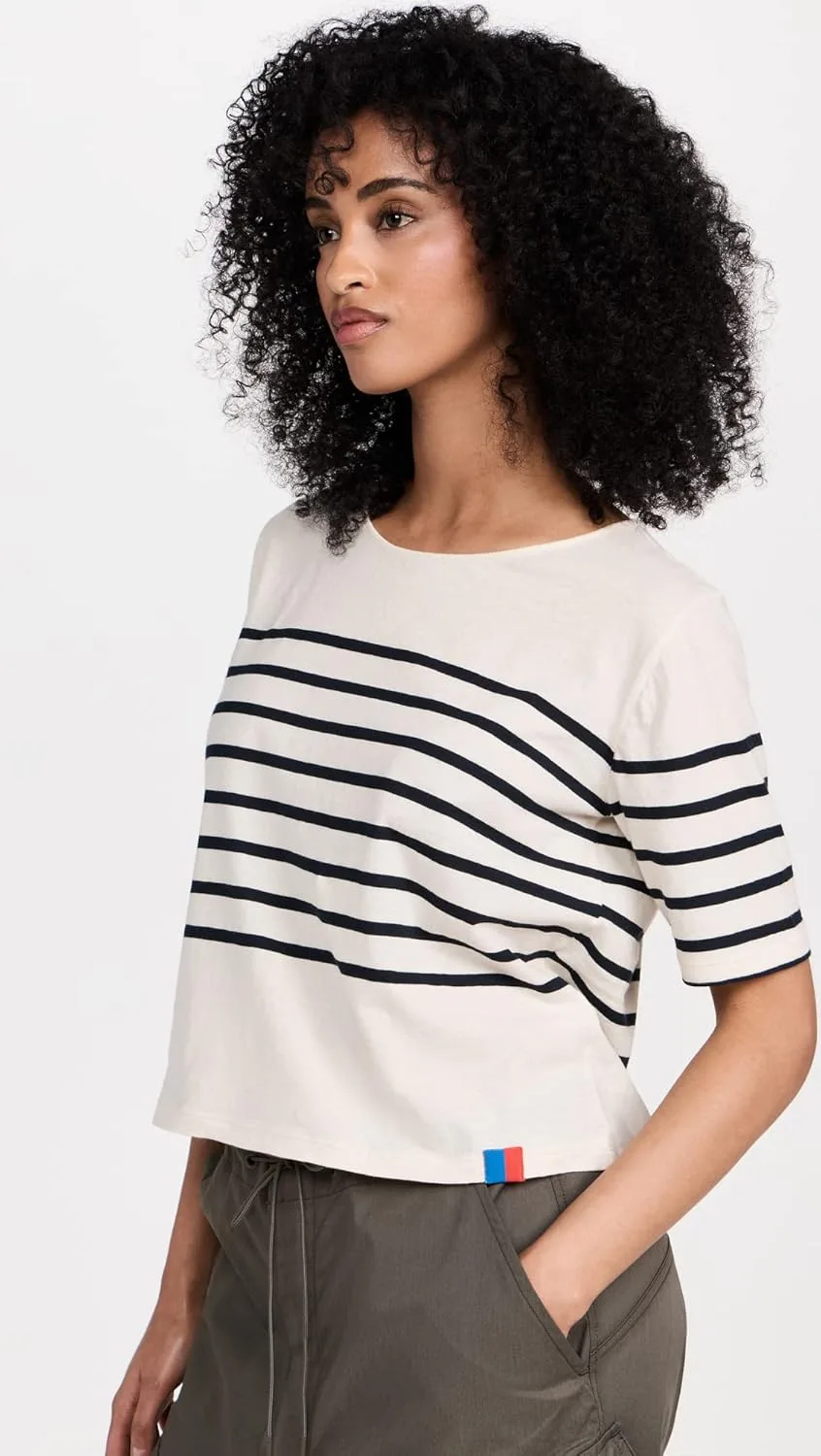 Круглый вырез и короткие рукава, полосатый узор.