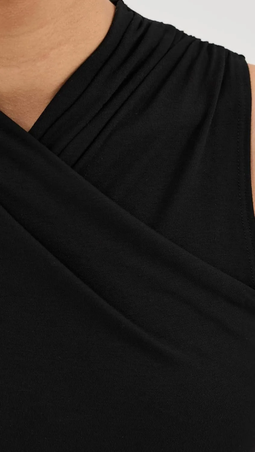 Название модели: Черное облегающее платье без рукавов с запахом из вискозы и лайкры.