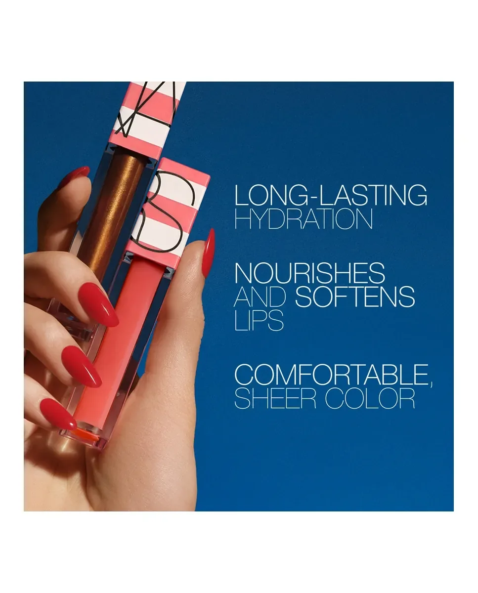Блеск для губ Hot Escape After Glow от NARS - это глянцевый продукт с высокой интенсивностью, который обеспечивает соблазнительный и полупрозрачный блеск. Этот продукт ограниченной серии представлен в упаковке с яркими полосками. Его гелево-маслянистая текстура мягко скользит по губам, обеспечивая легкое и комфортное ощущение. Содержит масло семян малины и экстракт граната, которые питательно и долго увлажняют губы. Формула включает Омега-3 и Омега-6, а также витамины Е и А, которые помогают смягчить и разгладить губы, оставляя их с гладкой и бархатистой поверхностью. Этот блеск является веганским и может использоваться самостоятельно для дополнительного увлажнения или поверх других средств для губ для создания блестящего эффекта.