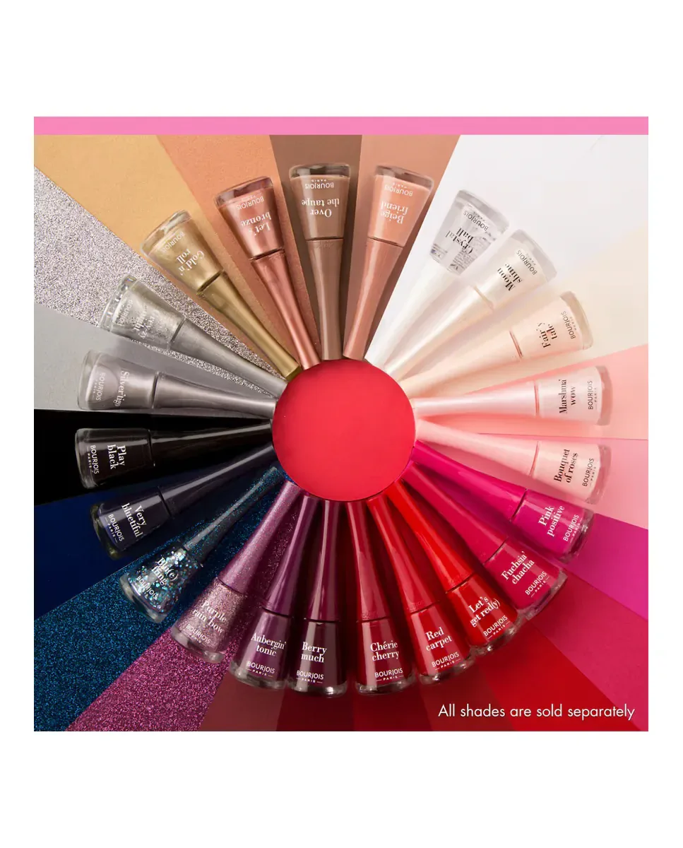 Лак для ногтей 1 Second от Bourjois обеспечивает профессиональный результат за короткое время. В комплект входит кисть с веерообразным эффектом, которая адаптируется к размеру и форме каждого ногтя, облегчая простое и аккуратное нанесение без пятен. Сохнет за 50 секунд и придает насыщенный цвет с блестящей поверхностью. Цветовая гамма включает классические и вечные варианты, а также современные альтернативы с особыми эффектами, что делает его универсальным выбором для различных случаев.