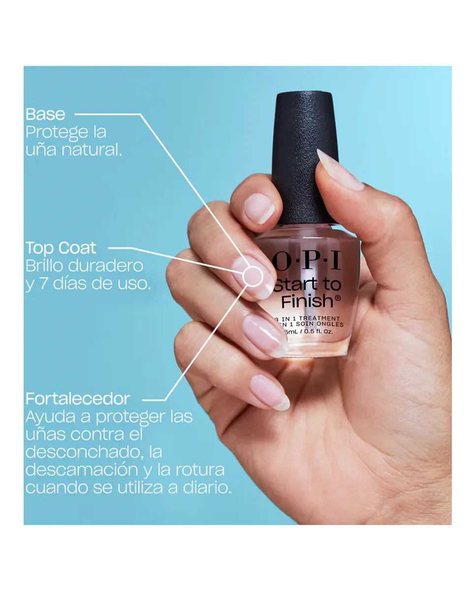 Лечение Start to Finish 3 в 1 от OPI - это продукт, который объединяет функции базового покрытия, верхнего покрытия и укрепителя в одной формуле. Содержит веганскую формулу, обогащенную витаминами A и E, которые способствуют здоровью ногтей. В качестве базового слоя он защищает ногти от обесцвечивания. В качестве верхнего покрытия обеспечивает долговечный блеск и помогает закрепить цвет. Кроме того, он действует как укрепитель, который защищает ногти от скола, шелушения и ломкости при ежедневном использовании. Этот продукт создан для обеспечения комплексного ухода за ногтями.