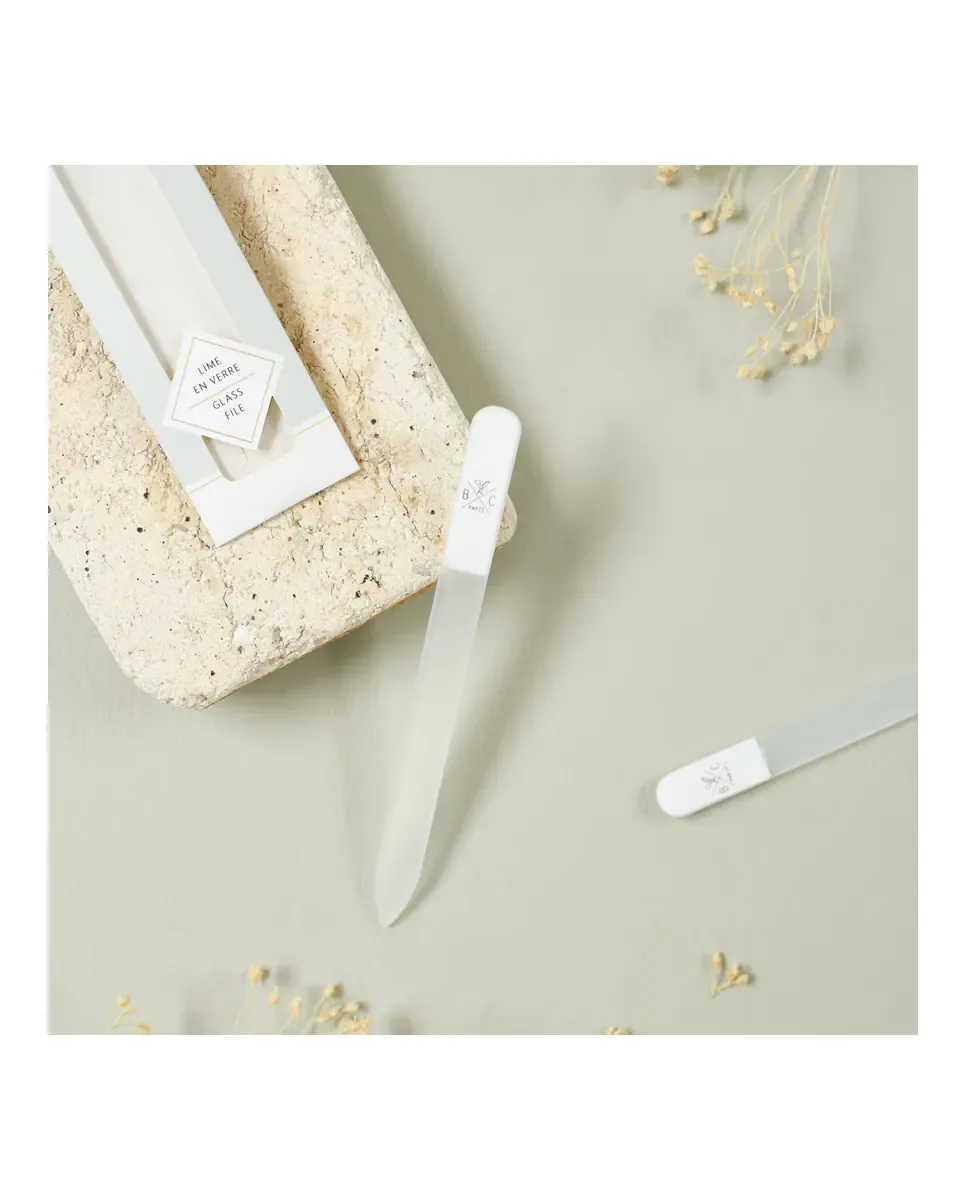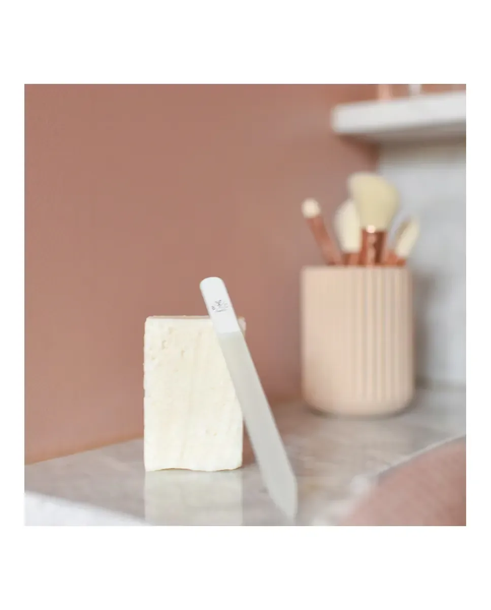 Стеклянная пилка позволяет укорачивать, подпиливать и придавать форму ногтям с точностью, предотвращая их ломкость благодаря мелкой зернистости.