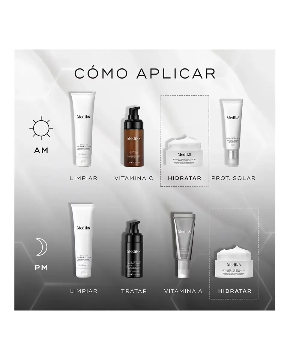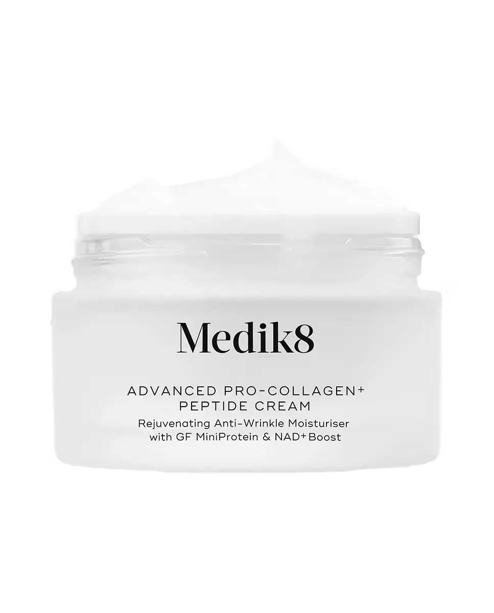 Крем Advanced Pro Collagen Peptide от Medik8 является антивозрастным средством, которое укрепляет кожу и повышает ее упругость и мягкость, одновременно предотвращая видимые признаки старения. В его формулу входят три ключевых ингредиента: усилитель долголетия NAD Longevity Booster, мини-белок Growth Factor MiniProtein и пептид Anti-A.G.E. (карнозин). Эта комбинация стимулирует естественное производство коллагена, эластина и гиалуроновой кислоты, способствуя восстановлению дермальной структуры и обеспечивая более гладкий и обновленный вид кожи. Продукт является унисекс и предназначен для борьбы с морщинами и улучшения общего состояния кожи.