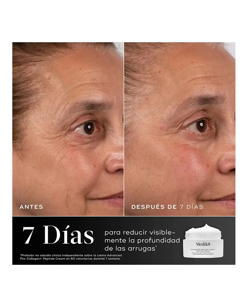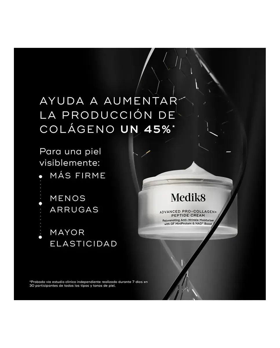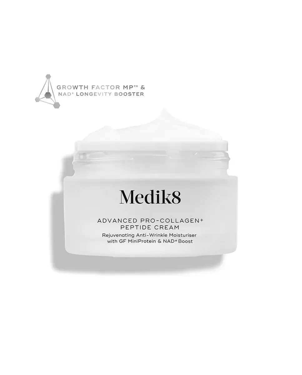 Крем Advanced Pro Collagen+ Peptide Крем Advanced Pro Collagen Peptide от Medik8 является антивозрастным средством, которое укрепляет кожу и улучшает ее упругость и мягкость, одновременно предотвращая видимые признаки старения. В его формулу входят три ключевых ингредиента: усилитель долголетия NAD Longevity Booster, мини-белок Growth Factor MiniProtein и пептид Anti-A.G.E. (карнозин). Эта комбинация стимулирует естественное производство коллагена, эластина и гиалуроновой кислоты, способствуя восстановлению дермальной структуры и обеспечивая более упругий и обновленный вид. Это унисекс-продукт, предназначенный для борьбы с морщинами и улучшения общего внешнего вида кожи.