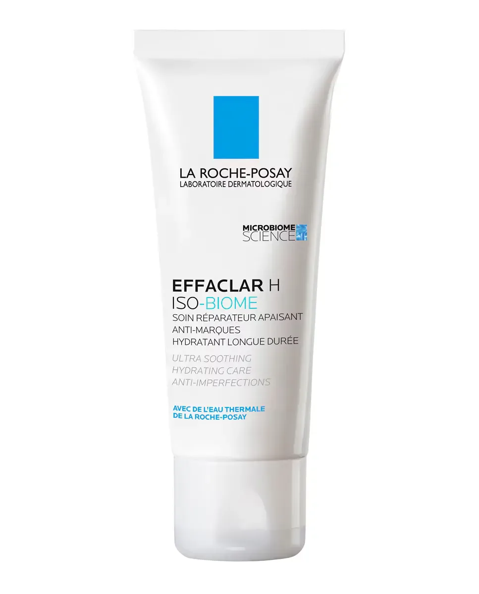 Крем Effaclar H Iso-Biome от La Roche Posay является увлажняющим и успокаивающим уходом, специально разработанным для жирной кожи с акне, ослабленной подсушивающими процедурами. Содержит Aqua Posae Filiformis, пребиотик, который укрепляет кожный барьер, и обогащен экстрактом Орелляна и Procerad, которые помогают уменьшить следы и недостатки. Его преимущества включают увлажнение и восстановление кожи, восстановление баланса микробиома, успокаивающий эффект и снижение следов. Эффективность продукта была подтверждена, показывая, что с первого применения кожа ощущается успокоенной и увлажненной в течение 48 часов, с уменьшением покраснения и сухости при постоянном использовании. Также было доказано, что он уменьшает видимость прыщей и черных точек, делая кожу более гладкой на ощупь и увеличивая увлажнение всего за несколько часов. Рекомендуется наносить крем на очищенное лицо.