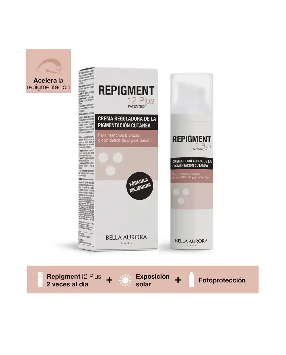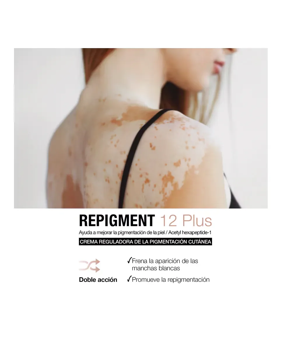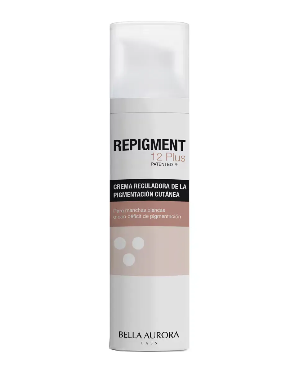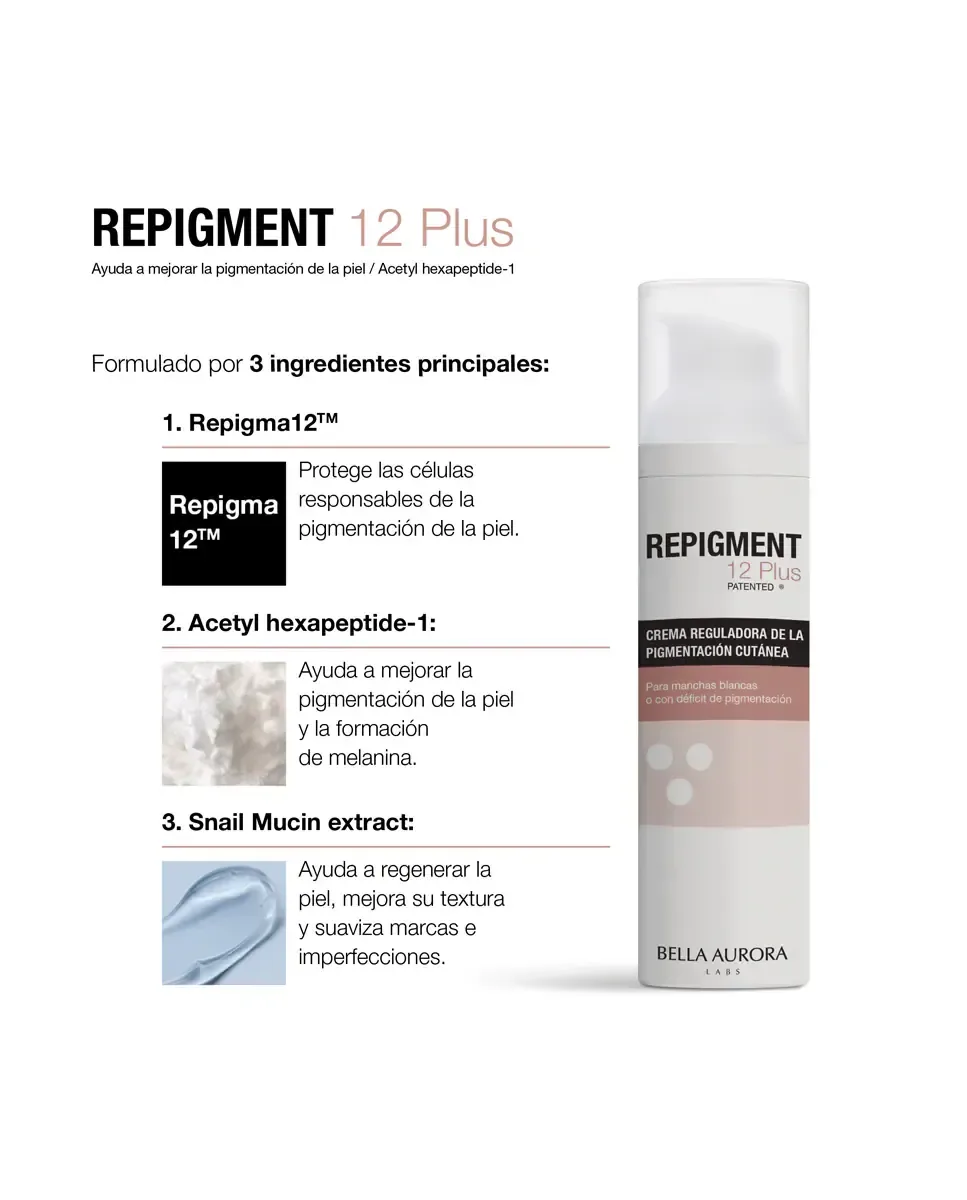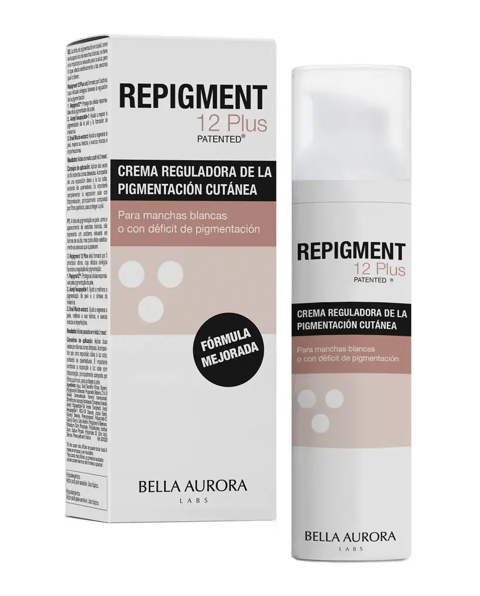 Крем Repigmentante Repigment12 Plus от Bella Aurora - это средство, которое борется с гипопигментацией и белыми пятнами на коже лица или тела. Его формула включает Repigma12TM, который блокирует белок MIA, отвечающий за депигментацию, и стабилизирует меланоциты, способствуя репигментации при воздействии УФ-света. Содержит ацетилгексапептид-1, который стимулирует образование меланина и улучшает регенерацию кожи, а также экстракт слизи улитки. При постоянном применении результаты можно наблюдать через три месяца, восстанавливая естественный уровень меланина. Гипоаллергенно, дерматологически протестировано и подходит для чувствительной кожи, обеспечивая отличную переносимость. Это эффективное лечение гипопигментаций.