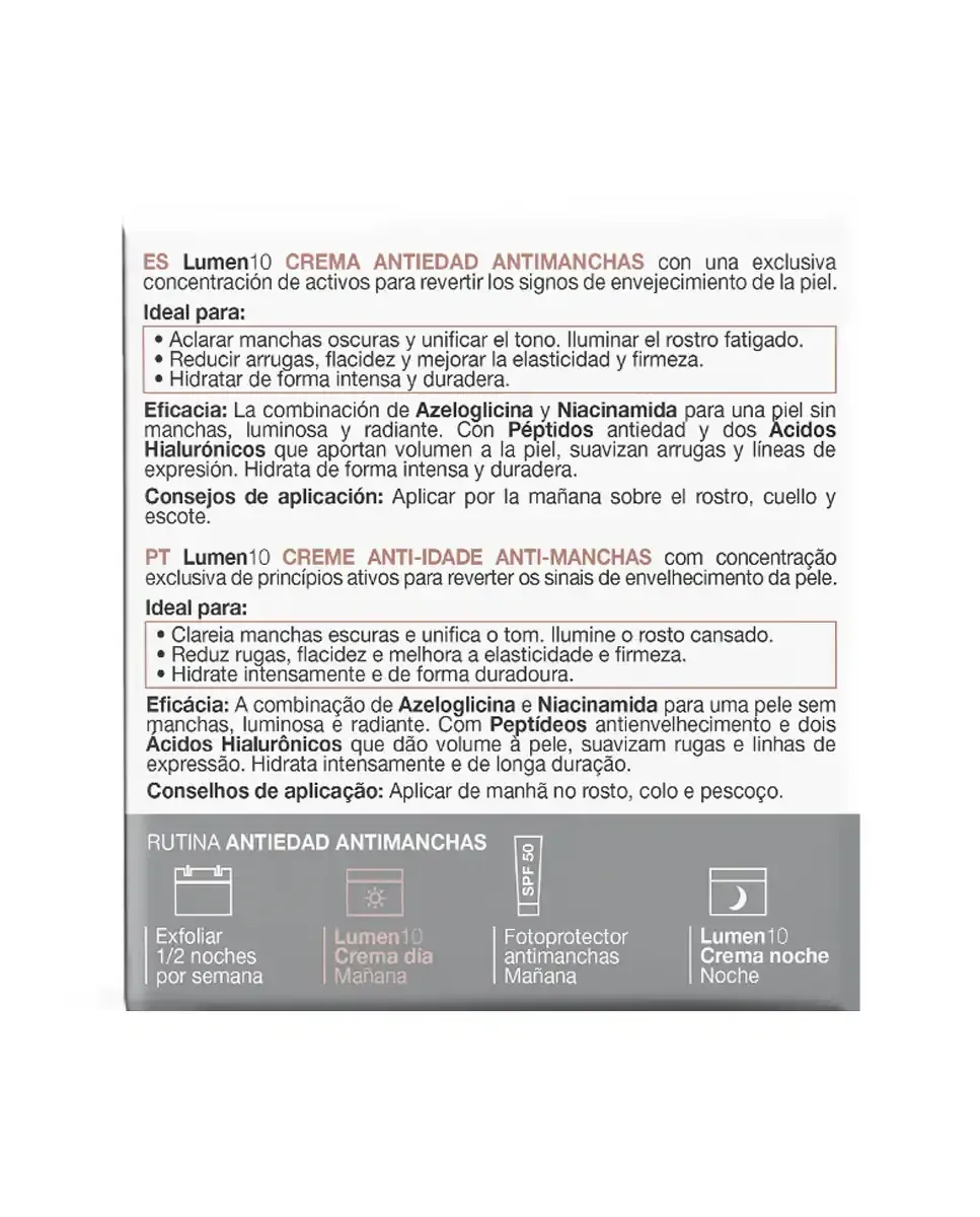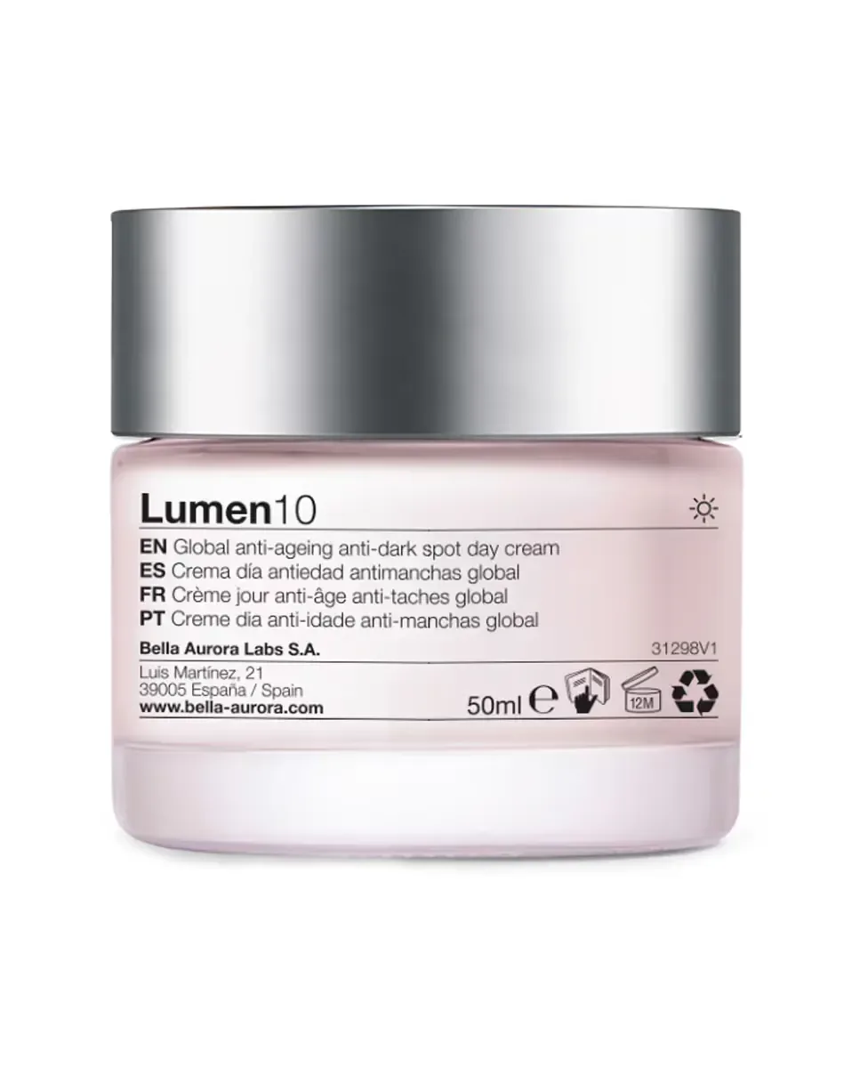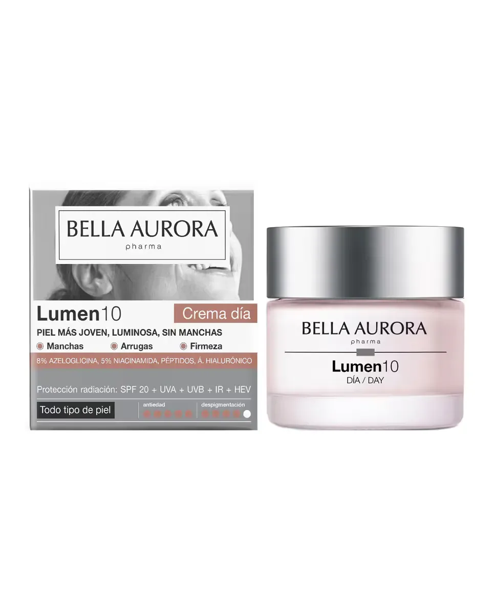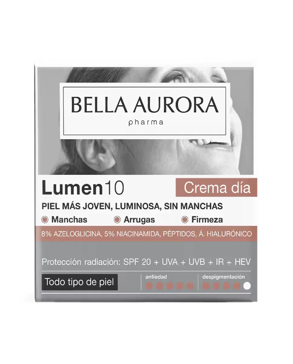 Дневной крем Lumen10 от Bella Aurora - это антивозрастное и против пигментных пятен средство. Этот унисекс-продукт осветляет темные пятна и выравнивает тон кожи. Сокращает морщины и линии выражения. Его формула придает упругость и улучшает эластичность кожи. Обеспечивает интенсивное и длительное увлажнение. Включает солнцезащитный фактор SPF 20, который защищает кожу от повреждений, вызванных UVA, UVB, инфракрасными лучами и синим светом (HEV). Содержит 8% Азелоглицин, ингибитор синтеза меланина, который помогает уменьшить пятна. Также включает 5% Ниацинамида (Витамин B3), который придает сияние и борется с тусклым тоном кожи. В состав входит комплекс антивозрастных пептидов, который стимулирует синтез структурных белков. Содержит гиалуроновую кислоту низкого и высокого молекулярного веса, которая обеспечивает мгновенное и длительное увлажнение, а также заполняет морщины. Рекомендуется наносить крем утром на лицо, шею и декольте на чистую кожу, выполняя легкий массаж доего полное всасывание.