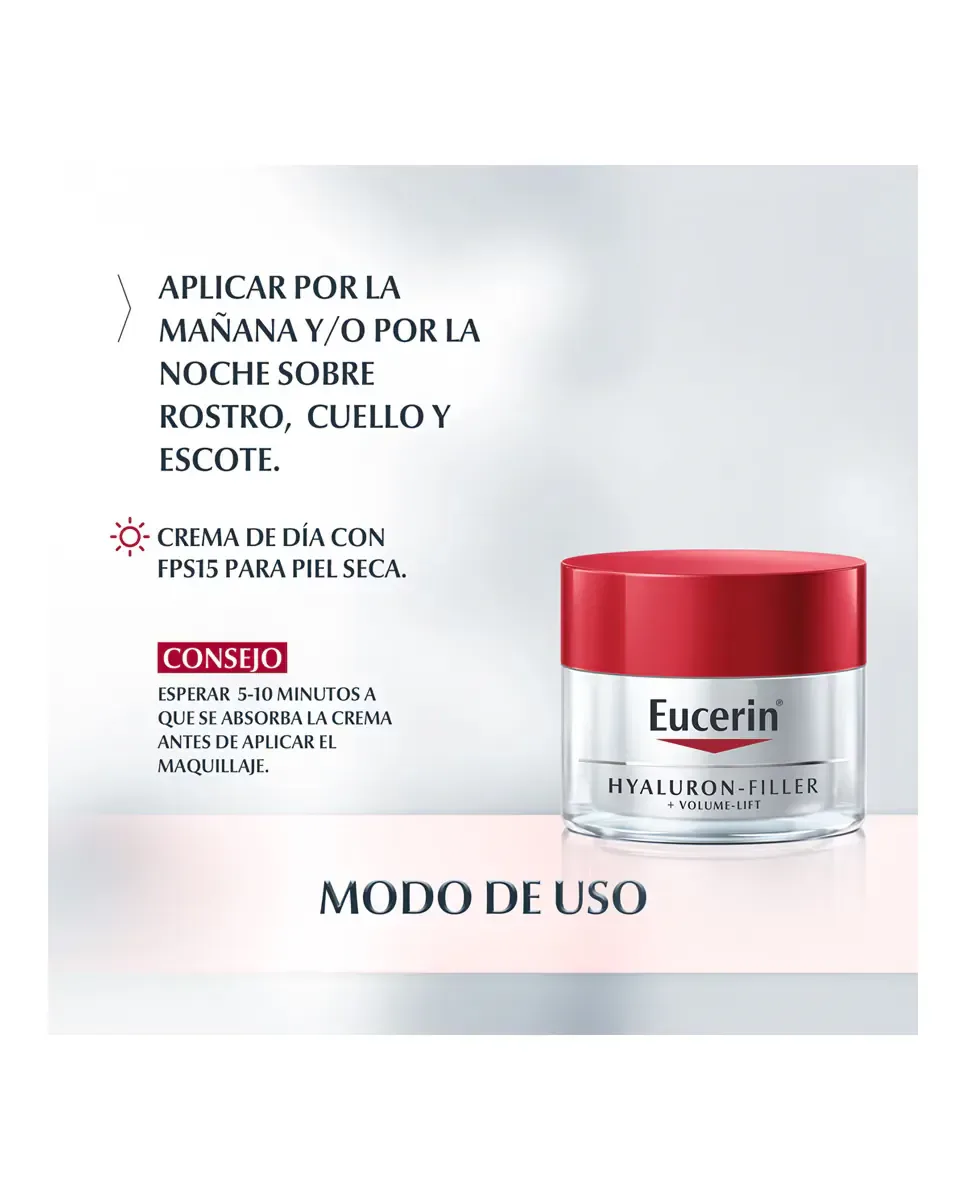 Крем Volume Filler от Eucerin - это антивозрастное средство, разработанное для сухой кожи. Этот продукт для ежедневного использования предназначен для восстановления объема лица и укрепления кожи изнутри. В его формуле присутствует гиалуроновая кислота с длинной цепью, которая обеспечивает увлажнение эпидермиса, и олигопептиды, стимулирующие синтез коллагена в дерме. Содержит магнолол, способствующий формированию адипоцитов в гиподерме, что помогает подчеркнуть скулы и переработать контур лица. Также помогает уменьшить морщины и обеспечивает солнечную защиту SPF 15 UVA, предотвращая старение кожи. Этот уход подходит женщинам старше 40 лет, у которых наблюдаются признаки потери объема лица. Не содержит парабенов и красителей. Рекомендуется применять на весь лиc утром, мягко массируя до полного впитывания.