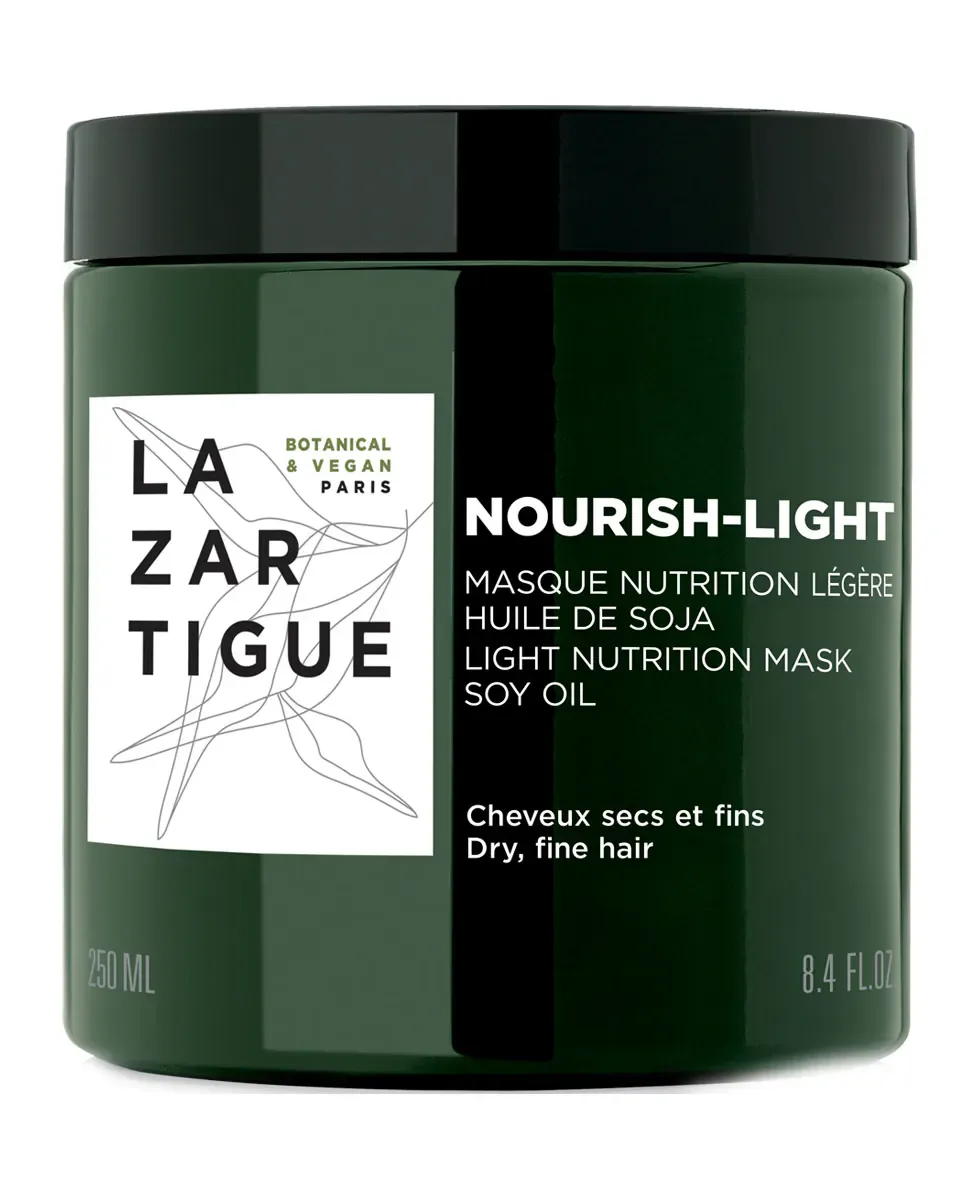 Маска Nourish Light от Lazartigue представляет собой питательное средство для сухих и тонких волос. Она содержит соевое молоко и соевое масло, обеспечивая легкое питание без утяжеления. Формула включает 92% натуральных ингредиентов, которые питают и укрепляют волокна волос. Кремовая текстура эффективно увлажняет волосы, не перегружая их, в результате волосы становятся обновленными и укрепленными. Этот продукт уважает окружающую среду, имеет веганскую сертификацию и не содержит сульфатов и силиконов.