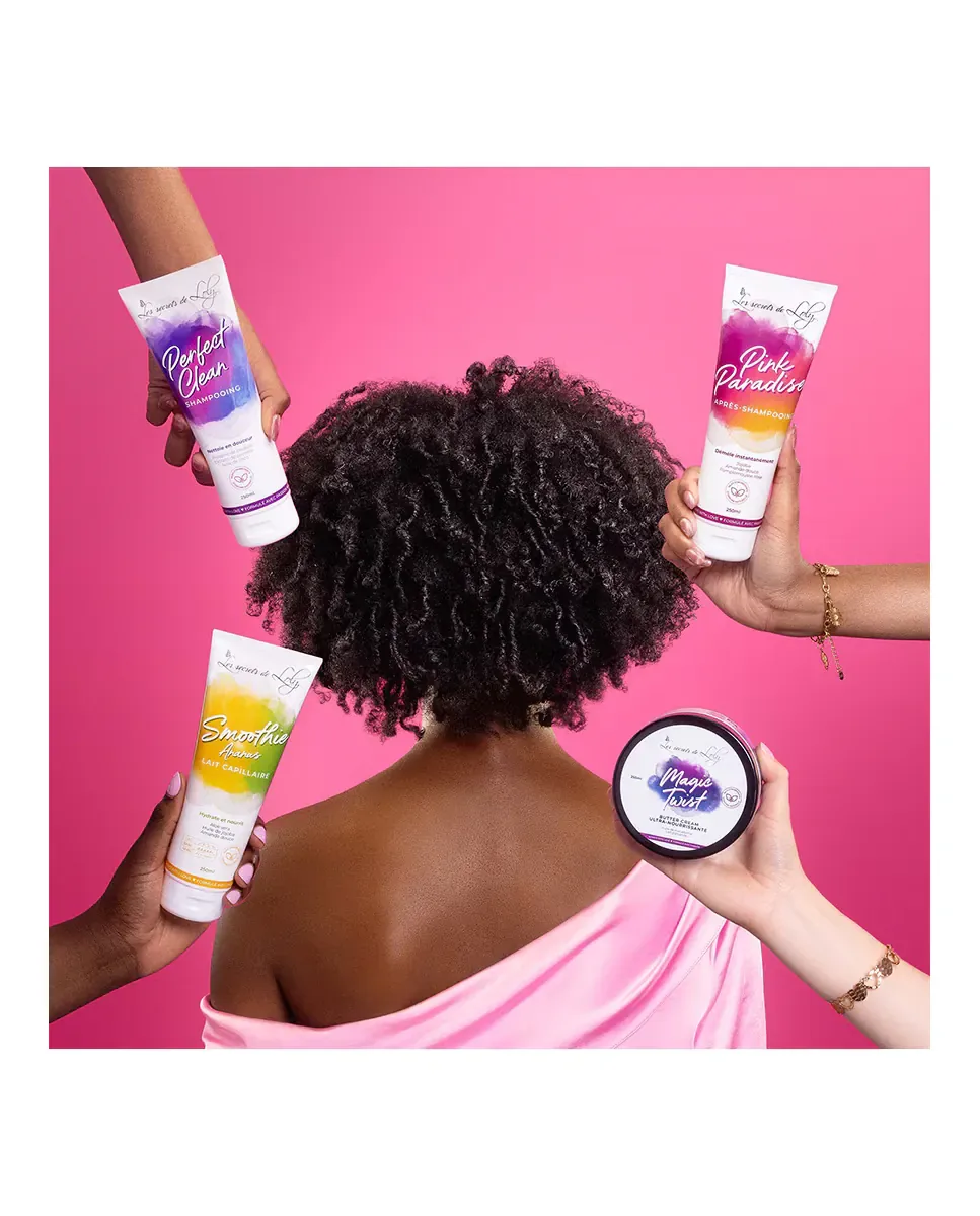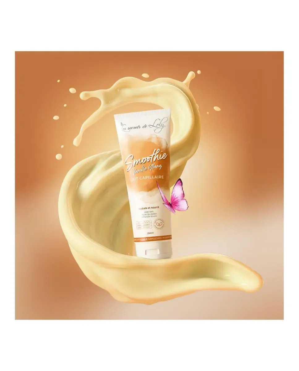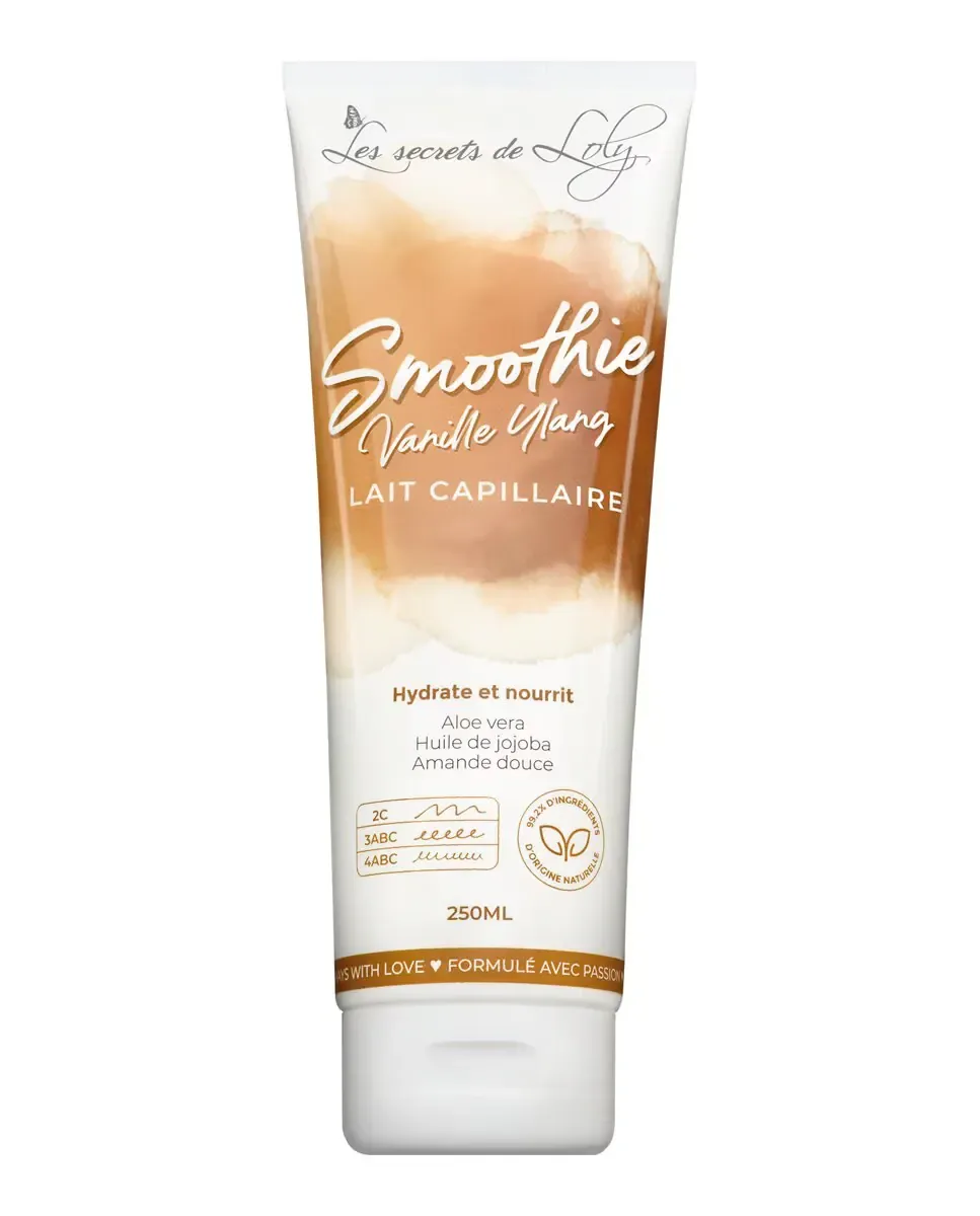 Питательное молочко для волос Smoothie Vanille Ylang от Les Secrets De Loly - это продукт, который обеспечивает питание и увлажнение волос, особенно для кудрявых и вьющихся волос. Содержит 99,2% ингредиентов натурального происхождения, включая алоэ вера, масло манго, масло сладкого миндаля и масло жожоба. Эти ингредиенты работают вместе, чтобы восстанавливать, защищать и смягчать волосы, ограничивая образование секущихся кончиков. Текстура молочная и имеет аромат ванили и эфирного масла иланг-иланга. Алоэ вера питает волокна волос, масло манго предотвращает секущиеся кончики, чистый баобабовый протеин увлажняет и укрепляет волосы, а растительная глицерин выступает в качестве увлажнителя. Масло жожоба оживляет и придает блеск, в то время как масло сладкого миндаля облегчает расчесывание. Провитамин B5 способствует укреплению и восстановлению волос, делая их блестящими, гибкими и легкими в укладке. Можно наносить ежедневно.на сухие или влажные волосы.