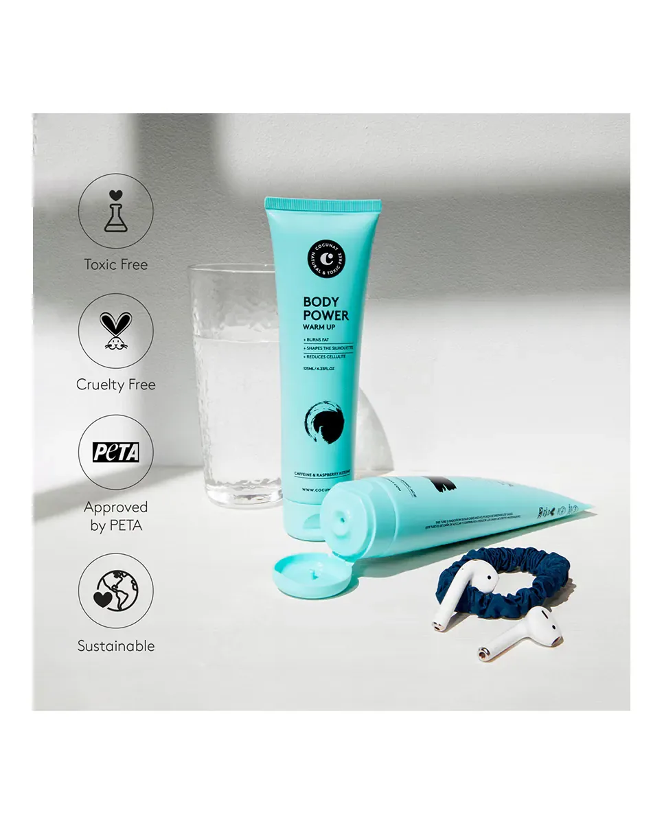 Антицеллюлитный дуэт Body Power от Cocunat - это курс ухода, который действует в два этапа: до тренировки и во время отдыха. Этот продукт содержит активные ингредиенты, такие как кофеин, физетин, кетон малины и гинкго билоба, которые помогают уменьшить целлюлит и скорректировать силуэт. Первый этап, WARM UP, наносится перед тренировкой и активирует кровообращение, обеспечивая мышцы энергией и помогая уменьшить видимость целлюлита. Второй этап, SMART BURN, использует технологию тройного действия, активируемую в состоянии покоя, стимулируя укрепление кожи и сжигание жира. Клинические результаты показывают, что после 8 недель использования можно уменьшить до 5,7 см в объеме бедер и ягодиц, до 5 см в объеме живота и до 2,4 см в объеме рук. Выпускается в форматах 150 мл и 125 мл, рекомендуется наносить оба продукта с активным массажем и круговыми движениями для лучшего впитывания.