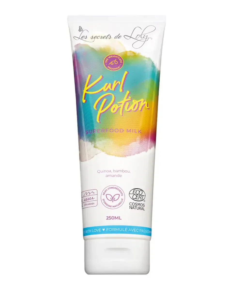 Несмываемый крем Kurl Potion от Les Secrets De Loly - это несмываемый уход, созданный для кудрявых и вьющихся волос. Этот продукт, известный как "Superfood Milk", содержит комплекс, который оживляет и интенсивно увлажняет, помогая формировать и структурировать текстурированные пряди. Придает объем, легкость и блеск. Питает и структурирует волосы, способствуя образованию более эластичных локонов и улучшая их плотность и текстуру. Легкая кремовая формула предотвращает скученность локонов и подходит для ежедневного использования. Содержит 17 аминокислот, которые поддерживают увлажнение, укрепляют волос и повышают эластичность, защищая волосы от повреждений. В составе есть масло сладкого миндаля для смягчения и облегчения расчесывания, киноа, которая проникает в структуру волос и защищает их от воздействия окружающей среды, бамбук, который уменьшает ломкость, и оливковое масло, которое придает мягкость и блеск. Наносится небольшое количество на влажные волосы от корней до кончиков без необходимости смывания.