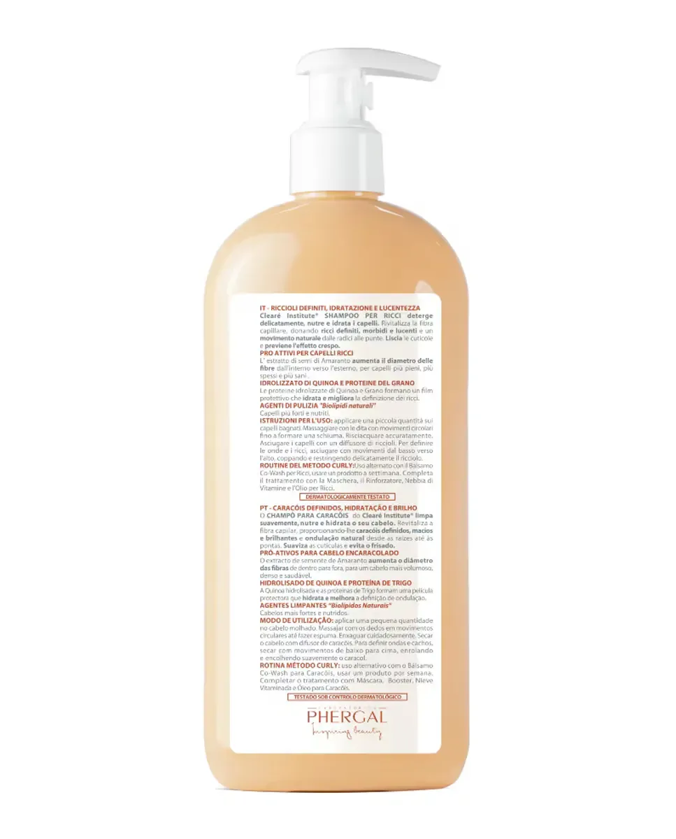 Шампунь от Clearé Institute разработан для мягкой очистки волос, обеспечивая питание и увлажнение. Он оживляет волокно волос, создавая четко очерченные, мягкие и блестящие кудри с естественным движением от корней до кончиков. Его формула разглаживает кутикулу и помогает предотвратить пушение. Представлен как 5-в-1 уход, который формирует кудри, делает их более мягкими и блестящими, уменьшает пушение и ломкость, очищает, не нарушая барьерную функцию волос, и питает и увлажняет, оставляя волосы мягкими и сияющими. Подходит для всех типов кожи и предназначен для женской аудитории.
