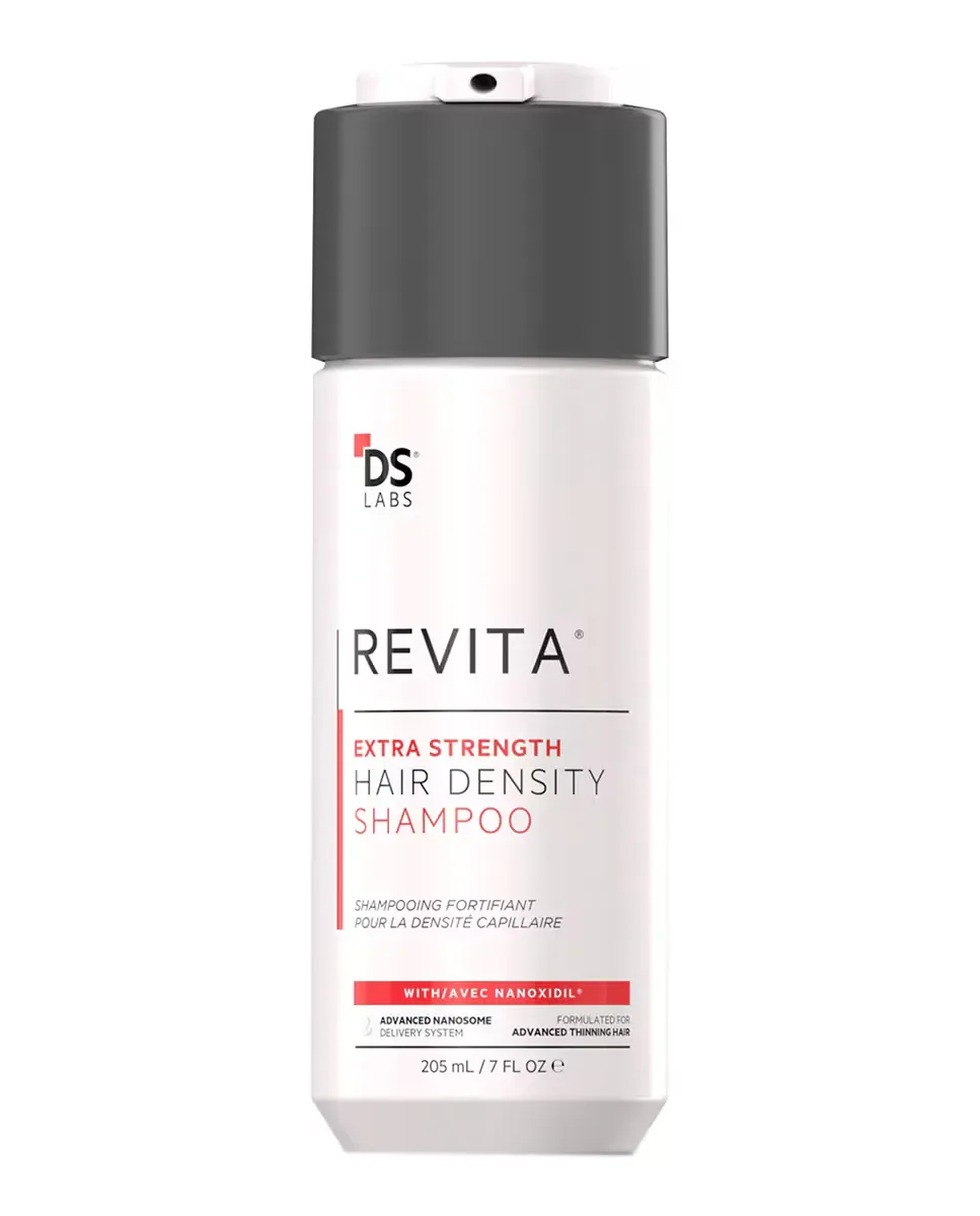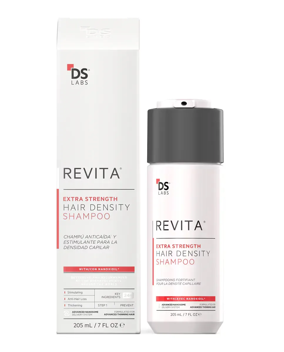 Шампунь Revita Extra Strength от DS Laboratories является продуктом против выпадения волос и стимулирующим средством, который улучшает плотность волос. Он разработан дерматологами и обеспечивает комплексное воздействие на экосистему волос, включая фолликулы, кожу головы и стержень волоса. Эффективен при лечении андрогенной алопеции продвинутой стадии у женщин и мужчин. В его формулу входит Наноксидил, альтернатива Миноксидилу, а также 24 активных ингредиента, которые стимулируют и питают волосяные фолликулы, продлевают фазу роста волос и увеличивают снабжение корней питательными веществами и кислородом. Этот шампунь способствует более густым, пышным и сильным волосам. Он клинически протестирован, не содержит агрессивных химических веществ, на 100% веганский и подходит для кудрявых и окрашенных волос. Наносится на влажные волосы и кожу головы, оставляется на две минуты и смывается.