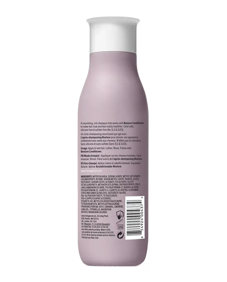 Шампунь Restore от Living Proof - это восстанавливающий шампунь, предназначенный для восстановления волос и разрыва цикла повреждений. Он мягко очищает и помогает восстановить уровень увлажненности волос, защищая кутикулу поврежденных волос. Его формула отталкивает грязь и жир, поддерживая чистоту волос дольше. Содержит OFPMA, запатентованную молекулу, которая способствует здоровью волос. Регулярное использование способствует восстановлению качеств здоровых волос. Наносится на влажные волосы, распределяя и массируя от корней до кончиков, оставляется на несколько минут перед смыванием. Для достижения результатов достаточно одного применения шампуня.