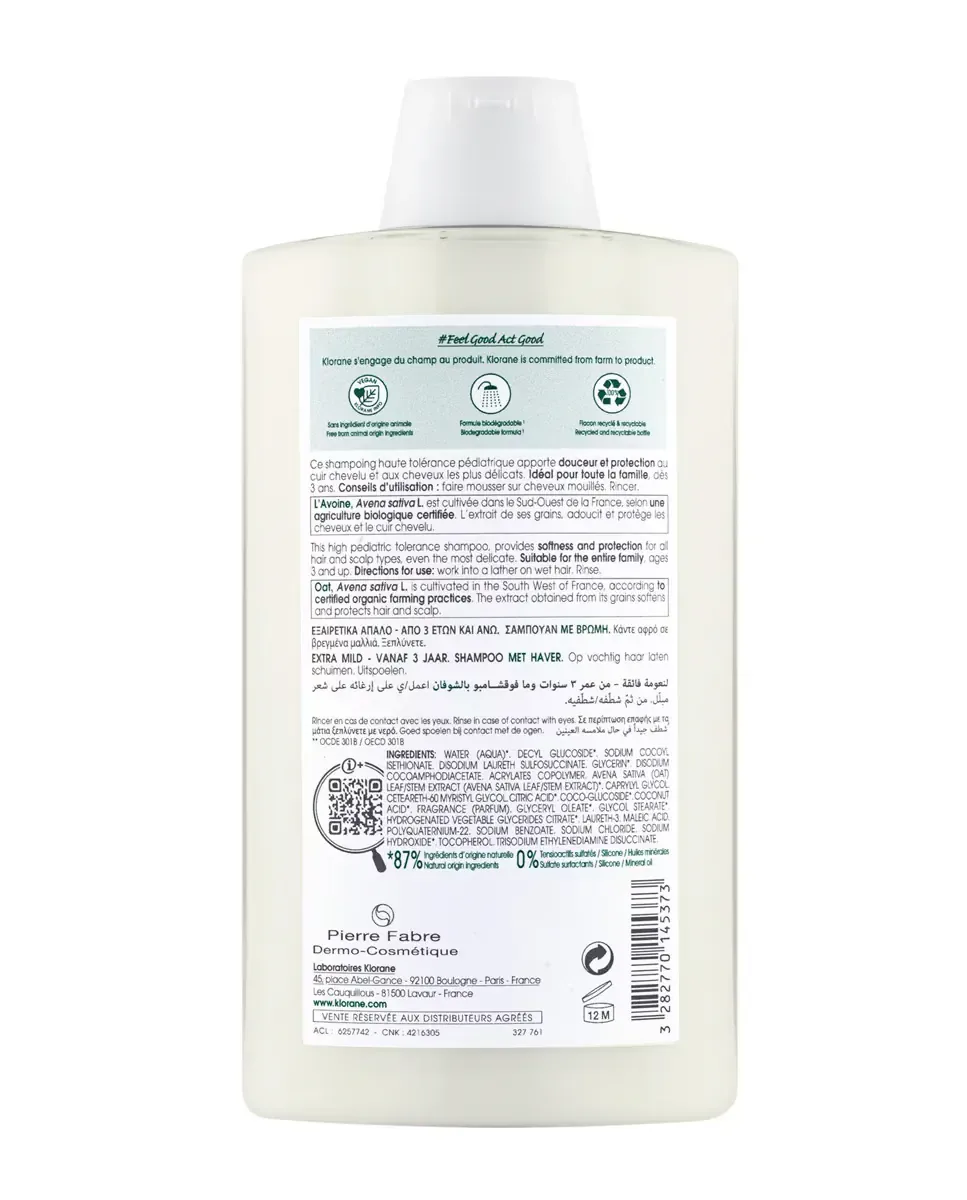Шампунь с овсом Klorane - это продукт для частого использования, который обеспечивает дополнительную мягкость и предназначен для всех типов волос, подходит для использования с 3 лет. Этот шампунь очищает, смягчает, защищает и облегчает расчесывание волос. Его формула не содержит сульфатов, силиконов и минеральных масел. В его составе 87% ингредиентов натурального происхождения, он веганский и биоразлагаемый, что делает его экологически безопасным выбором. Его высокая переносимость делает его подходящим для всей семьи.