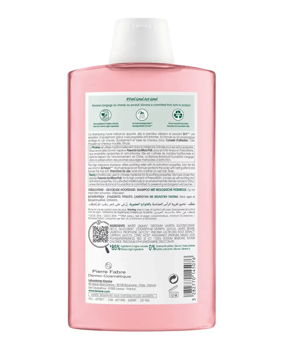 Био-шампунь с пионом от Klorane разработан для чувствительной и раздраженной кожи головы. Обладает успокаивающими свойствами, обеспечивая мгновенное облегчение и комфорт на протяжении 24 часов. Его формула имеет физиологический pH и не содержит сульфатных ПАВ, силиконов и минеральных масел. Содержит 85% ингредиентов природного происхождения и биоразлагаем, что делает его экологически безопасным. Используется путем нанесения на влажные волосы с последующим смыванием.