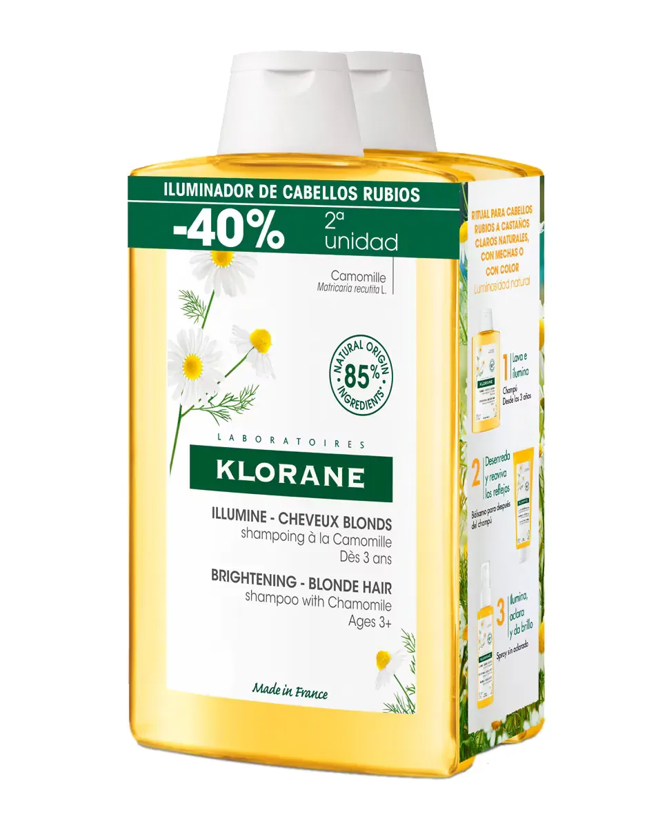 Двойной шампунь с ромашкой от Klorane - это средство для мытья и распутывания волос. Он создан на основе ультрамягкого моющего средства и обогащен компонентами для укладки и придания блеска. Обеспечивает легкое распутывание и блестящий эффект. Легкая формула не утяжеляет волосы. Подходит для светлых, натурально-каштановых волос, а также волос с мелированием, окрашенных или осветленных. Подходит для всей семьи с 3 лет. Содержит ромашку, выращенную в Египте, которая обладает осветляющими свойствами. Эффективность продукта была проверена: 94% участников отметили мягкость, а 84% - осветляющий эффект, согласно тесту с 31 испытуемым. Формула биоразлагаема и тестировалась под дерматологическим контролем.