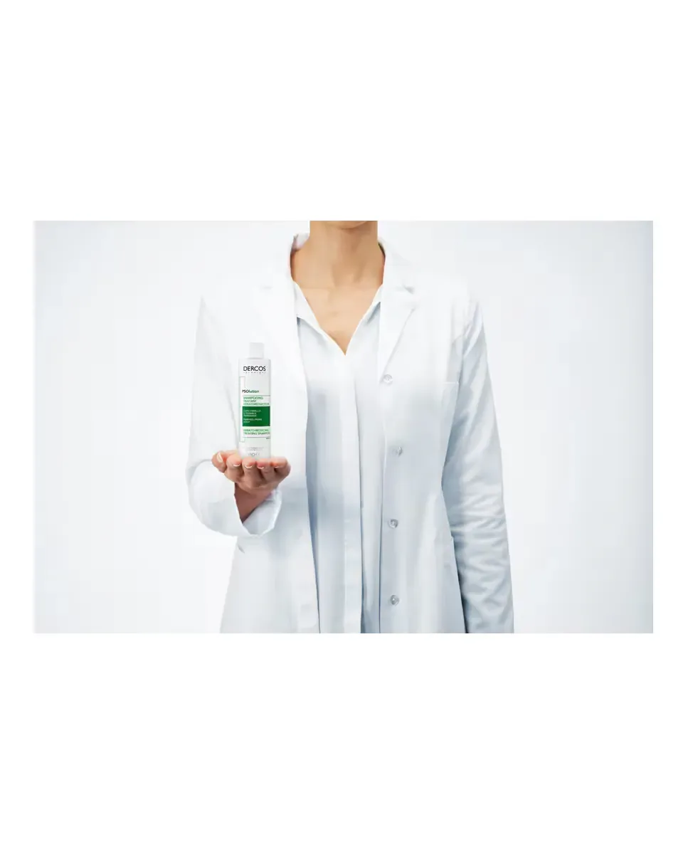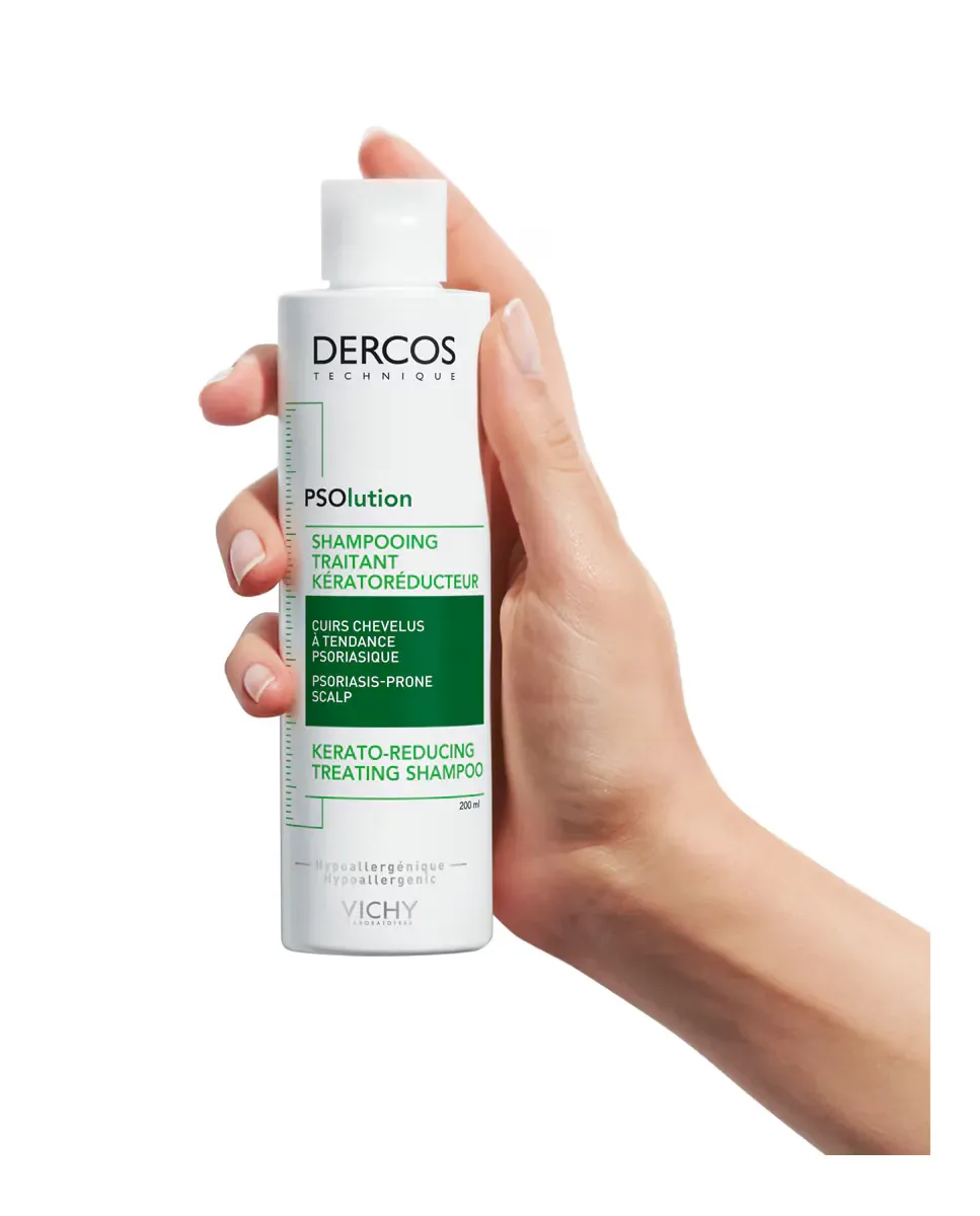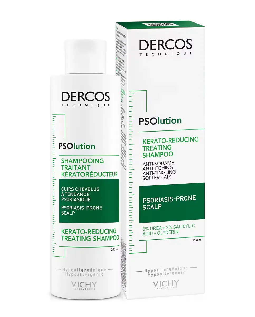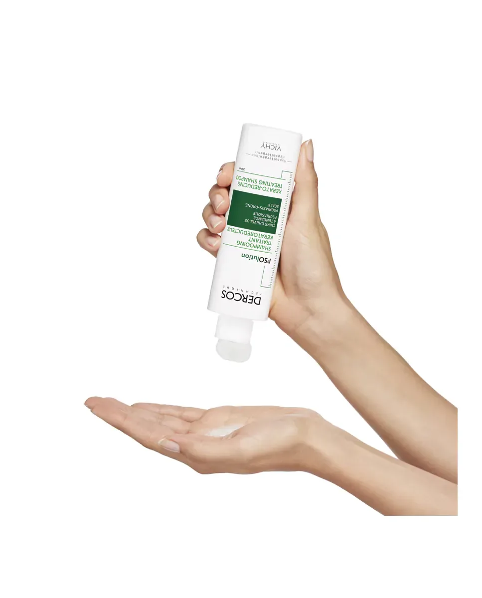 Шампунь против перхоти Psolution для псориаза от Vichy Dercos является средством, разработанным для кожи головы с склонностью к псориазу. Этот кераторедуцирующий шампунь доказал свою эффективность в снижении зуда на 78%, чешуек на 69% и себума на 30% после недели использования. Он гипоаллергенен и был протестирован на чувствительной коже головы, что позволяет использовать его ежедневно. Рекомендуется равномерно распределять шампунь по коже головы, мягко массировать для удаления прилипших чешуек, оставлять на 3 минуты и тщательно смывать. Следует избегать контакта с глазами, в случае чего рекомендуется немедленно промыть их водой.