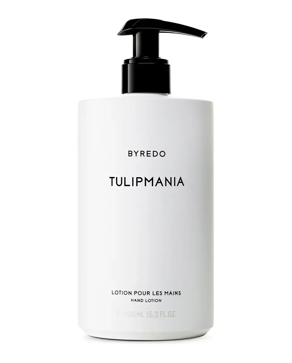 Лосьон для рук Tulipmania от Byredo разработан для ухода за кожей. Он обеспечивает глубокое увлажнение и длительный аромат, напоминающий о свежести весны. Его легкая формула содержит ноты фрезии и аккорд тюльпана, дополненные базой из светлых древесных нот. Выпускается в матовом бархатистом флаконе объемом 450 миллилитров и оснащен опциональным дозатором. Унисекс и подходит для ежедневного использования.