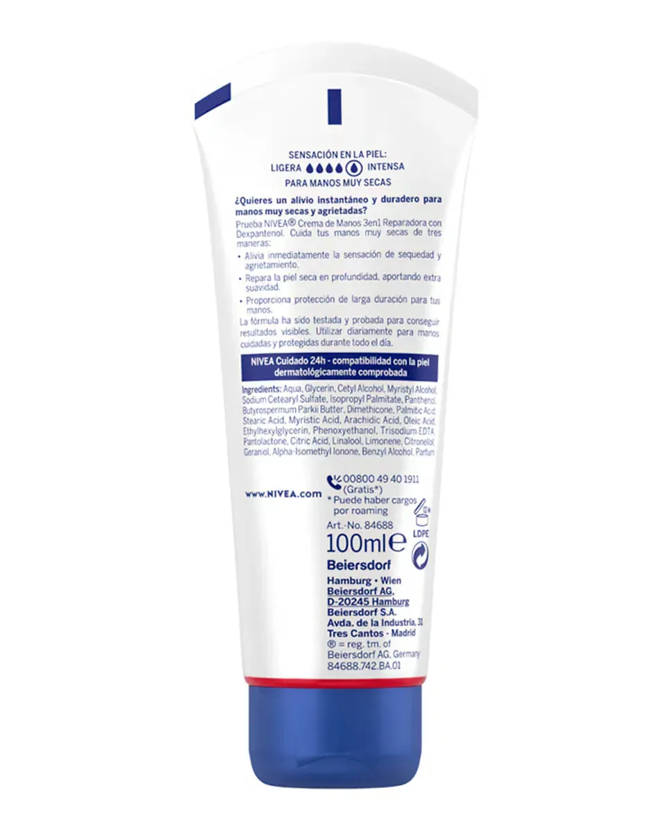 Восстанавливающий крем для рук Nivea, представленный в упаковке объемом 100 мл, разработан для смягчения очень сухих и потрескавшихся рук. Содержит декспантенол, который обеспечивает увлажнение в течение 48 часов и смягчает кожу. Его текстура тающая и быстро впитывающаяся, что позволяет крему впитываться в кожу, не оставляя жирного ощущения. Этот продукт предназначен для ежедневного ухода за руками, помогая восстанавливать кожу и делая ее мягкой и увлажненной.