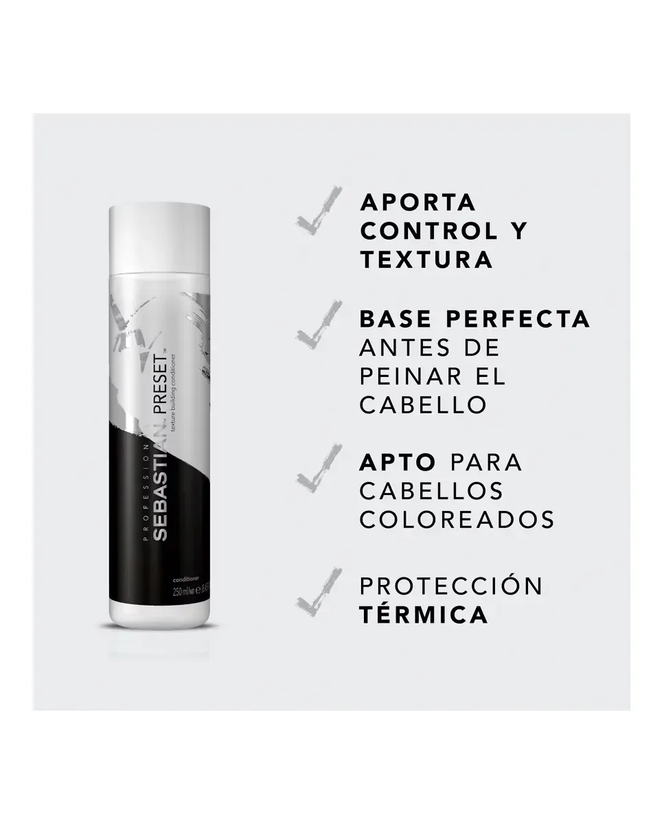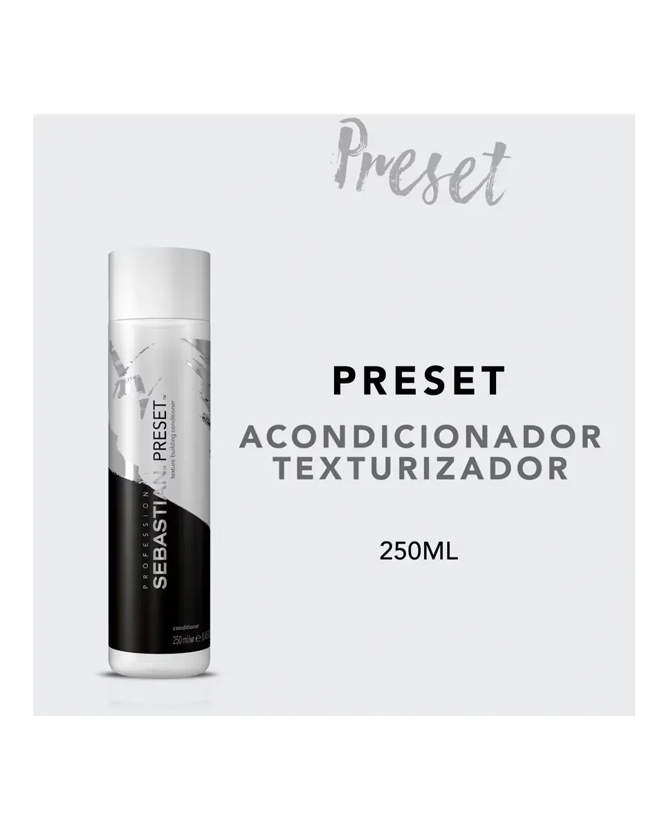 Кондиционер Preset объемом 250 мл от Sebastian Professional - это унисекс-кондиционер, который обеспечивает контроль и текстуру волос. Его анти-фриз формула защищает от тепла и помогает сохранять цвет волос. Этот продукт позволяет легко создавать прически и служит отличной основой перед укладкой. Наносится на волосы, высушенные полотенцем, с акцентом на кончики, и смывается большим количеством воды.