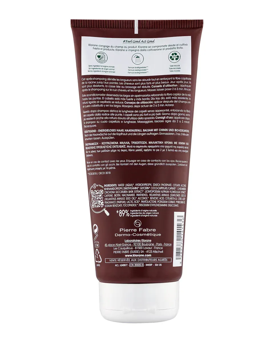 Кондиционер с хинином от Klorane - это укрепляющее средство для ослабленных волос с тенденцией к выпадению. Он действует как дополнение к антивыпадочным процедурам, эффективно подходит для длинных и средних волос. Помогает укрепить структуру волос и уменьшает ломкость при расчесывании. Его формула облегчает распутывание волос и придает им больше силы. Содержит 89% ингредиентов природного происхождения и не содержит силиконов и минеральных масел, что делает его веганским и биоразлагаемым вариантом. Наносится после шампуня, выдерживается 2-3 минуты и затем смывается.