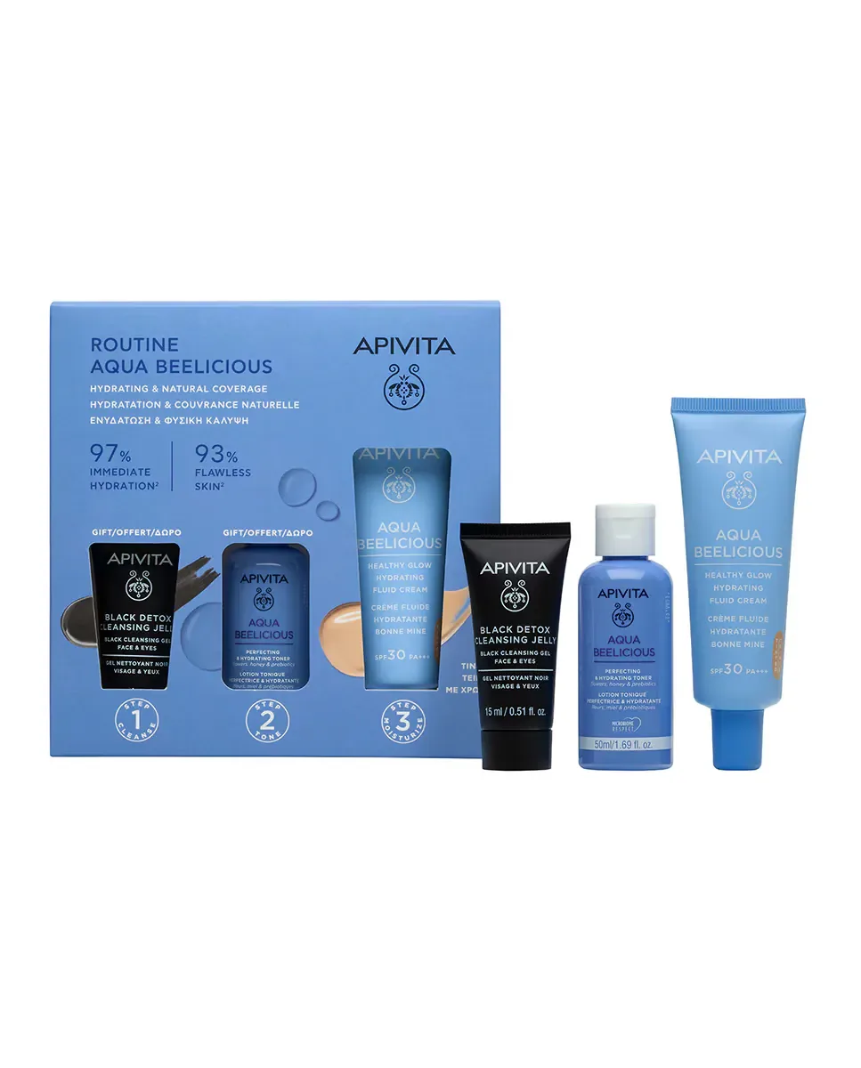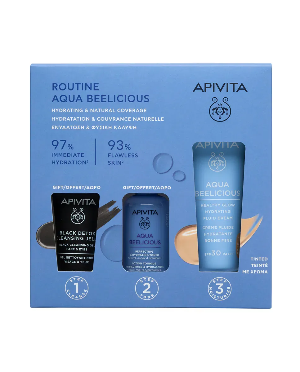 Подарочный набор Aqua Beelicious от Apivita представляет собой подарочную коробку, включающую увлажняющий светящийся крем с оттенком. Этот крем обеспечивает легкую текстуру и мгновенное увлажнение. Он разработан с использованием цветов цистон, ириса, дикой розы и меда, которые помогают восстановить увлажнение кожи и дарят ровный и сияющий вид благодаря пигментам натурального происхождения. Включает защиту от UVA, UVB и синего света с помощью фотостабильных солнцезащитных фильтров, а также антиоксидантную защиту от неблагоприятного воздействия окружающей среды с патентованным экстрактом прополиса. Вода в формуле заменена настоем дикой розы, усиливающим антиоксидантное действие. В набор также входит продукт Black Detox, который удаляет макияж и загрязнения, оставляя кожу свежей и чистой, а также тоник, улучшающий и увлажняющий кожу, смягчая ее и уменьшая недостатки, при этом уважая микробиом с помощью пребиотиков. Этот набор подходит для любой рутины ухода за кожей.л.