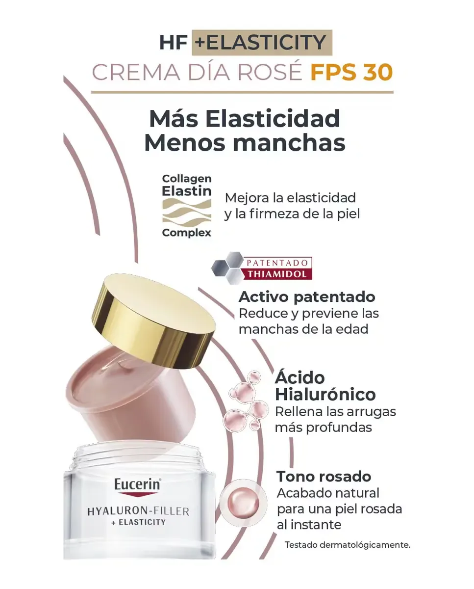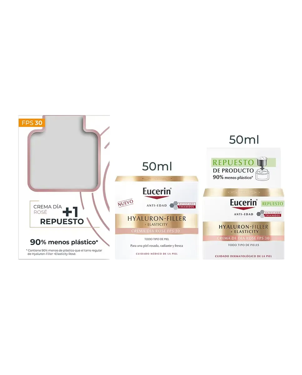 Антивозрастной набор Rosé SPF 30 от Eucerin разработан для борьбы с выраженными признаками старения. Он включает Thiamidol, который помогает уменьшить пигментные пятна старения, и комплекс коллагена и эластина, который улучшает упругость кожи. В этот набор входят лицевая крем и его сменная упаковка, обеспечивая полный дневной антивозрастной уход с осветляющим эффектом, который противодействует бледности и усталому виду лица. Дневной крем Hyaluron-Filler Elasticity Día Rosé SPF 30 придает коже естественный и здоровый оттенок. Его комбинация гиалуроновой кислоты с высокой и низкой молекулярной массой заметно заполняет глубокие морщины, а комплекс Collagen-Elastin стимулирует выработку коллагена. Кроме того, он содержит солнцезащитные фильтры SPF 30, которые защищают от преждевременного старения. Сменная упаковка сохраняет ту же антивозрастную формулу в более экологичном формате, сокращая использование пластика на 90%. Этот набор совместим со всеми упаковками Eucerin Cuida.для лица и действует комплексно, укрепляя, освещая и выравнивая тон кожи.