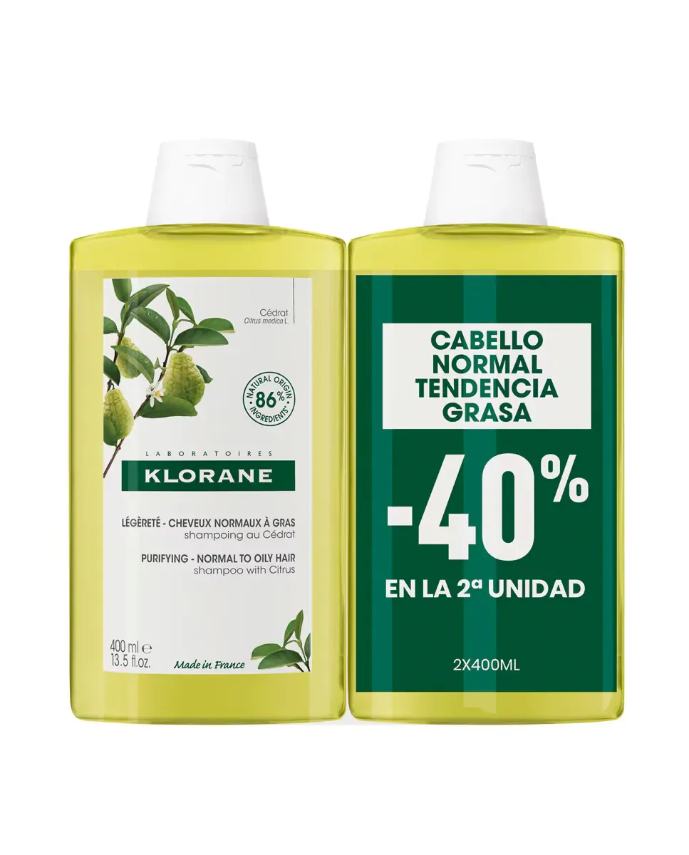 Набор Шампуня с Цедрой от Klorane включает две бутылки по 400 мл очищающего и восстанавливающего шампуня. Он предназначен для нормальных волос, склонных к быстрому загрязнению. Этот продукт очищает и purifies кожу головы, удаляя себум и загрязнения с первого применения. Его формула сочетает активный компонент, регулирующий выделение себума, с мякотью Цедры, древнего цитруса с Корсики, что помогает дольше сохранять волосы чистыми и способствует более здоровой коже головы. При использовании этого шампуня волосы становятся легче, чище и блестят, а также замедляется их утолщение. Поставляется в подарочной упаковке и подходит для обоих полов.