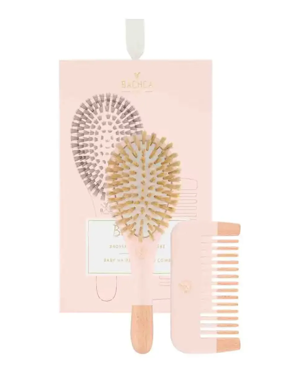 Подарочный набор для младенцев от бренда Bachca включает в себя необходимый комплект для ухода за волосами малышей и маленьких детей. В этот набор входят деревянная щетка с щетиной из 100% кабанской шерсти и деревянный гребень из бука. Оба предмета разработаны для мягкого расчесывания и ухода за волосами, заботясь о коже головы ребенка. Инструменты изготовлены вручную из бука, что обеспечивает долговечность и аккуратную отделку, подходящую для использования на нежных волосах самых маленьких. Этот продукт относится к категории товаров для ухода за детьми и предназначен для детской аудитории.