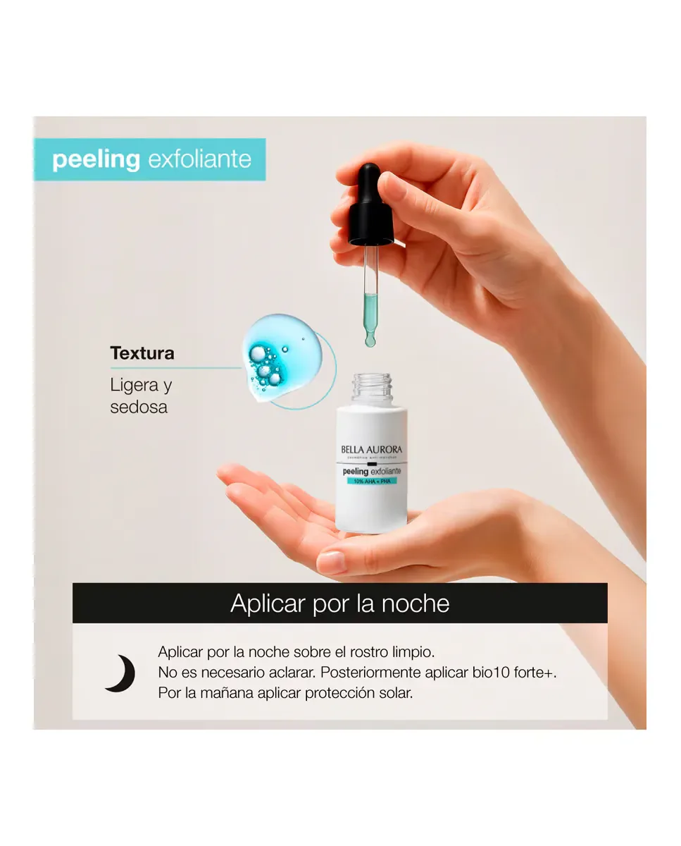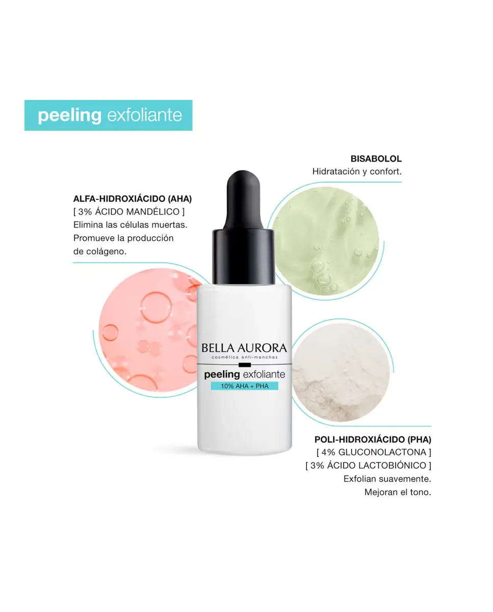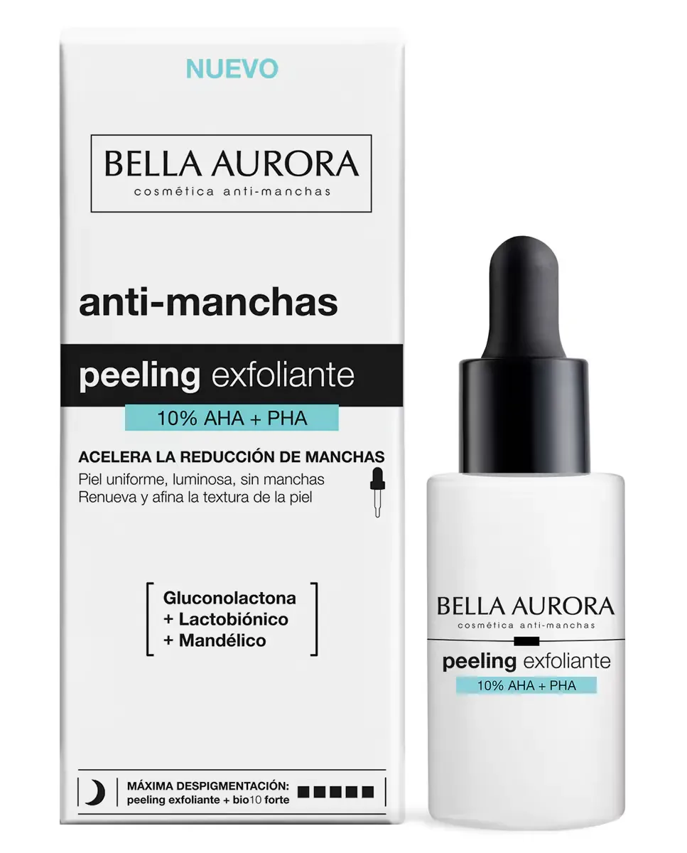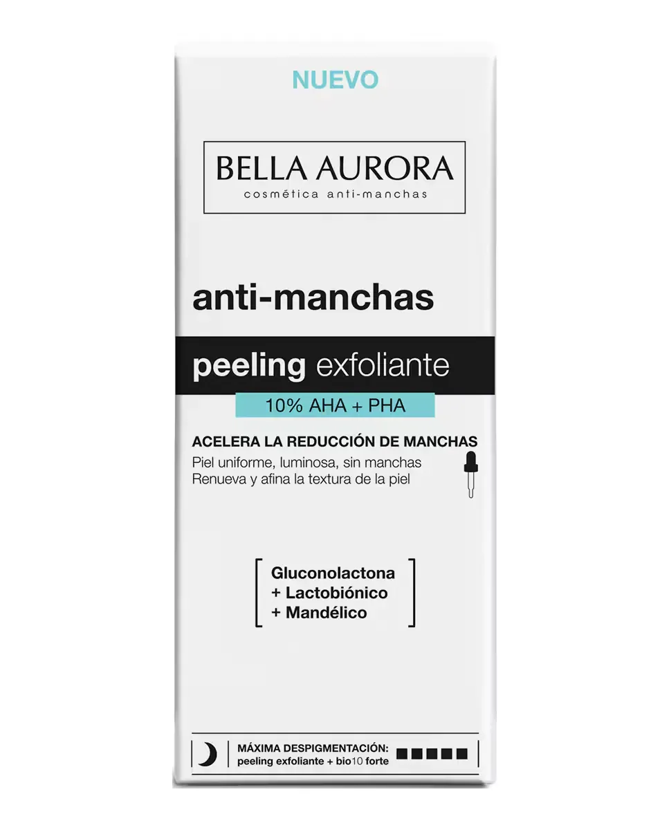 Анти-пятновый пилинг 10% AHAPHA от Bella Aurora - это обновляющее средство для депигментации кожи. Его усовершенствованная формула включает миндальную кислоту, глюконолактон и лактобионовую кислоту, которые действуют на разные слои кожи, ускоряя клеточное обновление, уменьшая пятна и несовершенства, а также улучшая текстуру кожи. Содержит бисаболол, который оказывает успокаивающее и увлажняющее действие, подходит для чувствительной кожи. Этот продукт универсален и предназначен для уменьшения темных пятен, восстановления и увлажнения кожи, а также для защиты от солнца и преждевременного старения. Внешнее исследование показало, что 95% участниц заметили более сияющую кожу, 86% - более светлую кожу, а 81% - уменьшение несовершенств. Рекомендуется ежедневное использование на ночь в течение первых десяти дней.