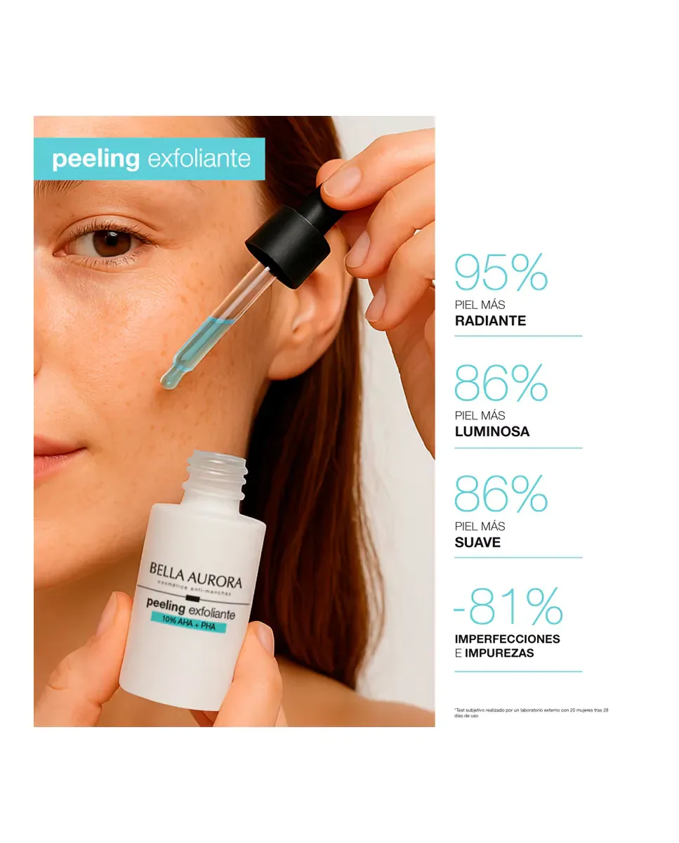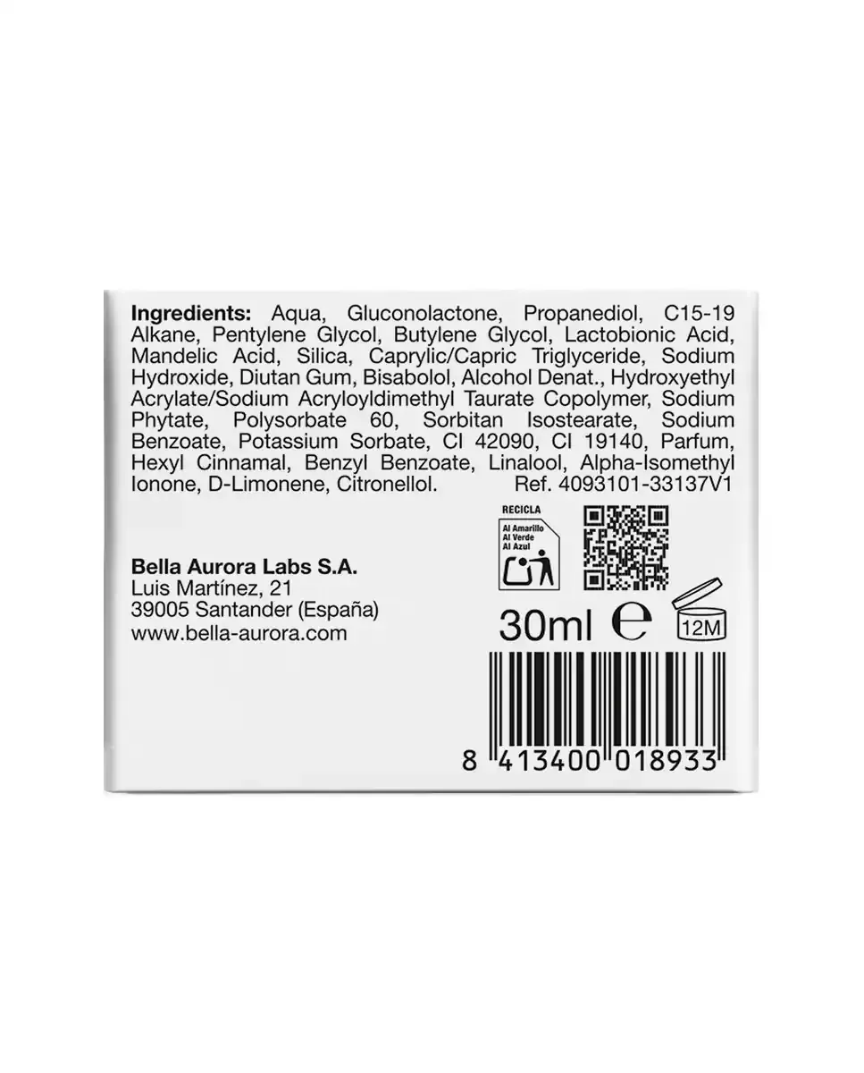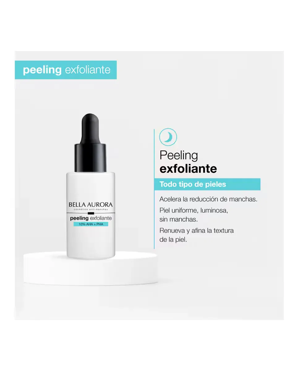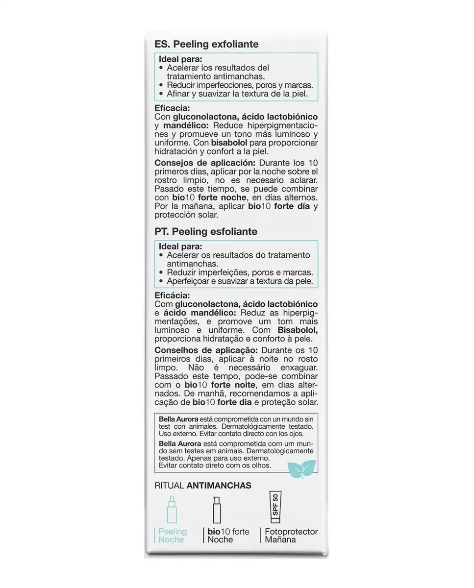 Анти-пятновый пилинг 10% AHAPHA от Bella Aurora - это обновляющее средство для депигментации кожи. Его усовершенствованная формула включает миндальную кислоту, глюконолактон и лактобионовую кислоту, которые действуют на разные слои кожи, ускоряя клеточное обновление, уменьшая пятна и несовершенства, а также улучшая текстуру кожи. Содержит бисаболол, который оказывает успокаивающее и увлажняющее действие, подходит для чувствительной кожи. Этот продукт универсален и предназначен для уменьшения темных пятен, восстановления и увлажнения кожи, а также для защиты от солнца и преждевременного старения. Внешнее исследование показало, что 95% участниц заметили более сияющую кожу, 86% - более светлую кожу, а 81% - уменьшение несовершенств. Рекомендуется ежедневное использование на ночь в течение первых десяти дней.