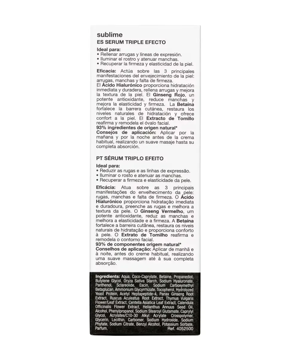 Сыворотка Sublime от Bella Aurora - это интенсивное антивозрастное средство, которое борется с морщинами, пятнами и недостаточной упругостью кожи. Она действует на самые глубокие слои, обеспечивая видимые и длительные результаты. В ее формулу входит гиалуроновая кислота, которая обеспечивает мгновенное и длительное увлажнение, помогая разгладить морщины и улучшить текстуру кожи. В состав также входит красный женьшень - антиоксидант, который уменьшает пятна и улучшает эластичность и упругость кожи. Бетаин укрепляет кожный барьер и восстанавливает естественный уровень увлажнения. Кроме того, экстракт тимьяна способствует укреплению и моделированию овала лица. Эта сыворотка подходит для всех типов кожи.