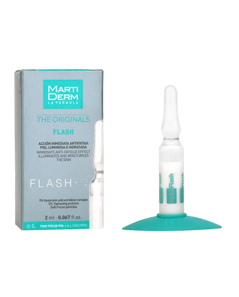 Флакон Flash от MartiDerm - это уход за лицом в формате 2 мл. Он обеспечивает мгновенный антиусталостный эффект, который оживляет кожу, улучшая ее внешний вид, упругость, сияние и плотность. Это унисекс-продукт, подходящий для всех типов кожи. Его формула действует как оптический корректор, минимизируя видимость морщин и несовершенств. Рекомендуется применять полфлакона на лицо, шею и декольте после обычного ухода за кожей, мягко массируя до полного впитывания. Также его можно использовать перед макияжем для усиления эффекта.
