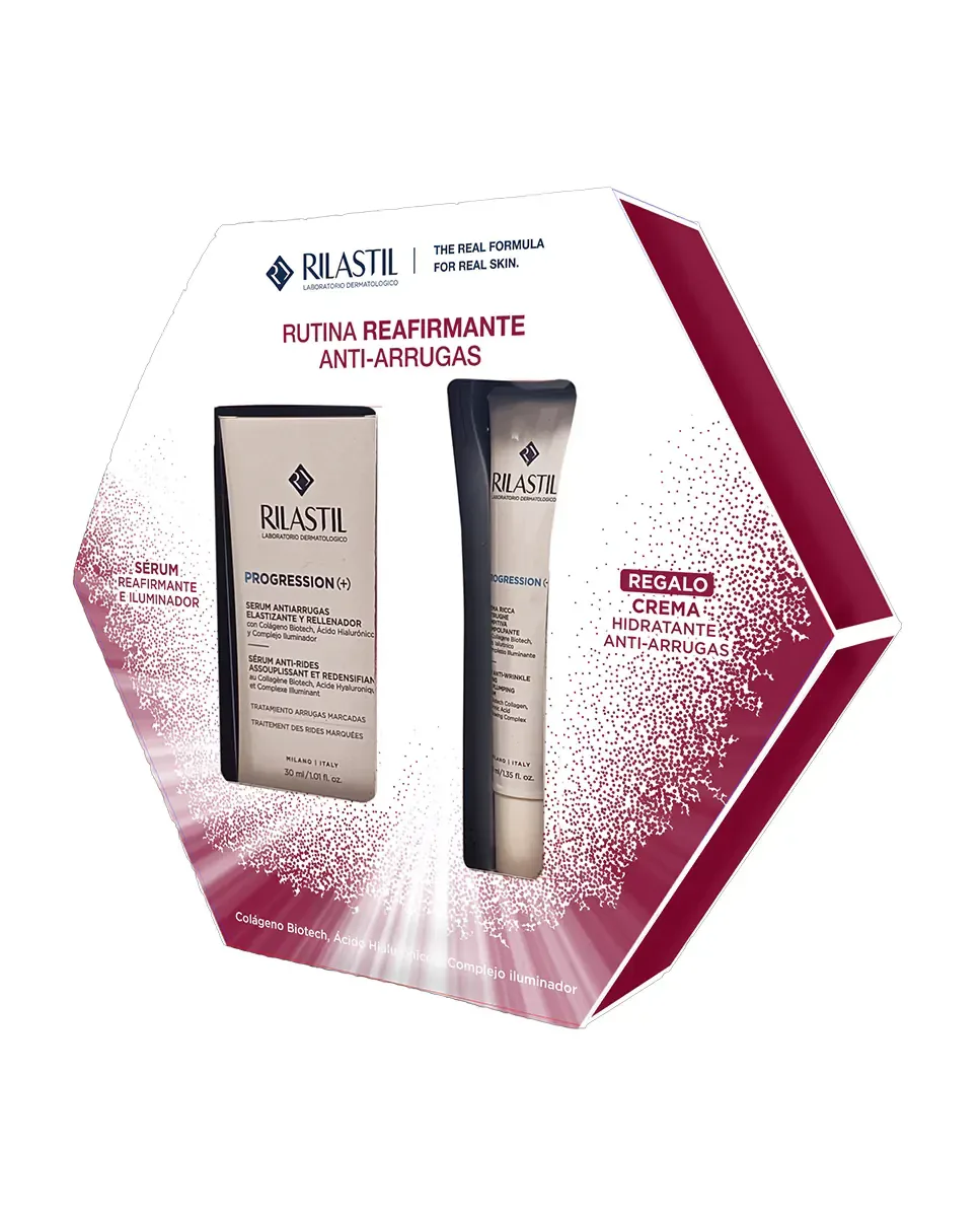 Набор Progression () 25 от Rilastil - это унисекс подарочный комплект, включающий сыворотку и крем. Оба продукта разработаны для борьбы с эффектами менопаузы и пременопаузы на коже. Сыворотка и крем воздействуют на морщины, дряблость, обезвоживание и недостаток сияния, обеспечивая лечение для уплотнения кожи, против морщин и повышения эластичности. Крем содержит гиалуроновую кислоту, которая обеспечивает увлажнение и укрепление, помогая предупреждать появление морщин. В состав входит осветляющий комплекс, который уменьшает гиперпигментацию и улучшает внешний вид кожи. Также включен биотехнологический эксполисахарид, который улучшает межклеточные связи, увеличивая толщину кожи и плотность коллагена, а также биотехнологический коллаген, который борется с морщинами и улучшает сияние. В течение 28 дней было зафиксировано увеличение коллагена на 27,2%, увлажнения на 62,1%, эластичности на 25,9% и сияния на 10%. Оба продукта были протестированы на коже.тяжелые, некомедогенные, клинически протестированные и гипоаллергенные.