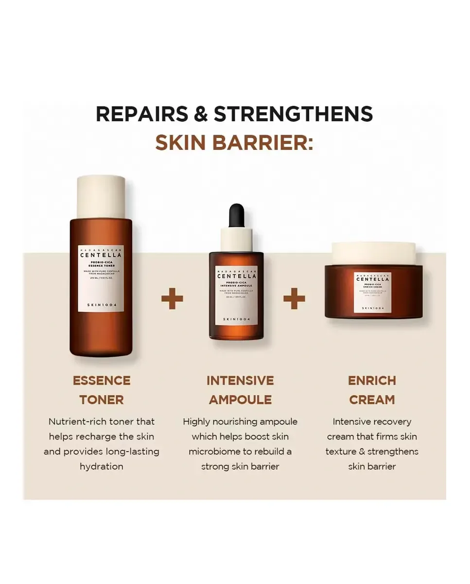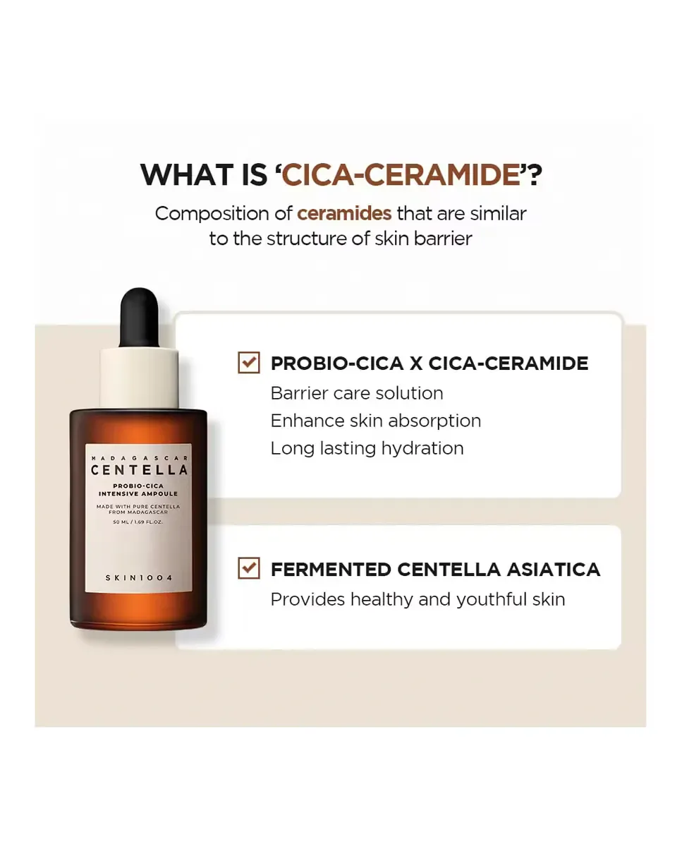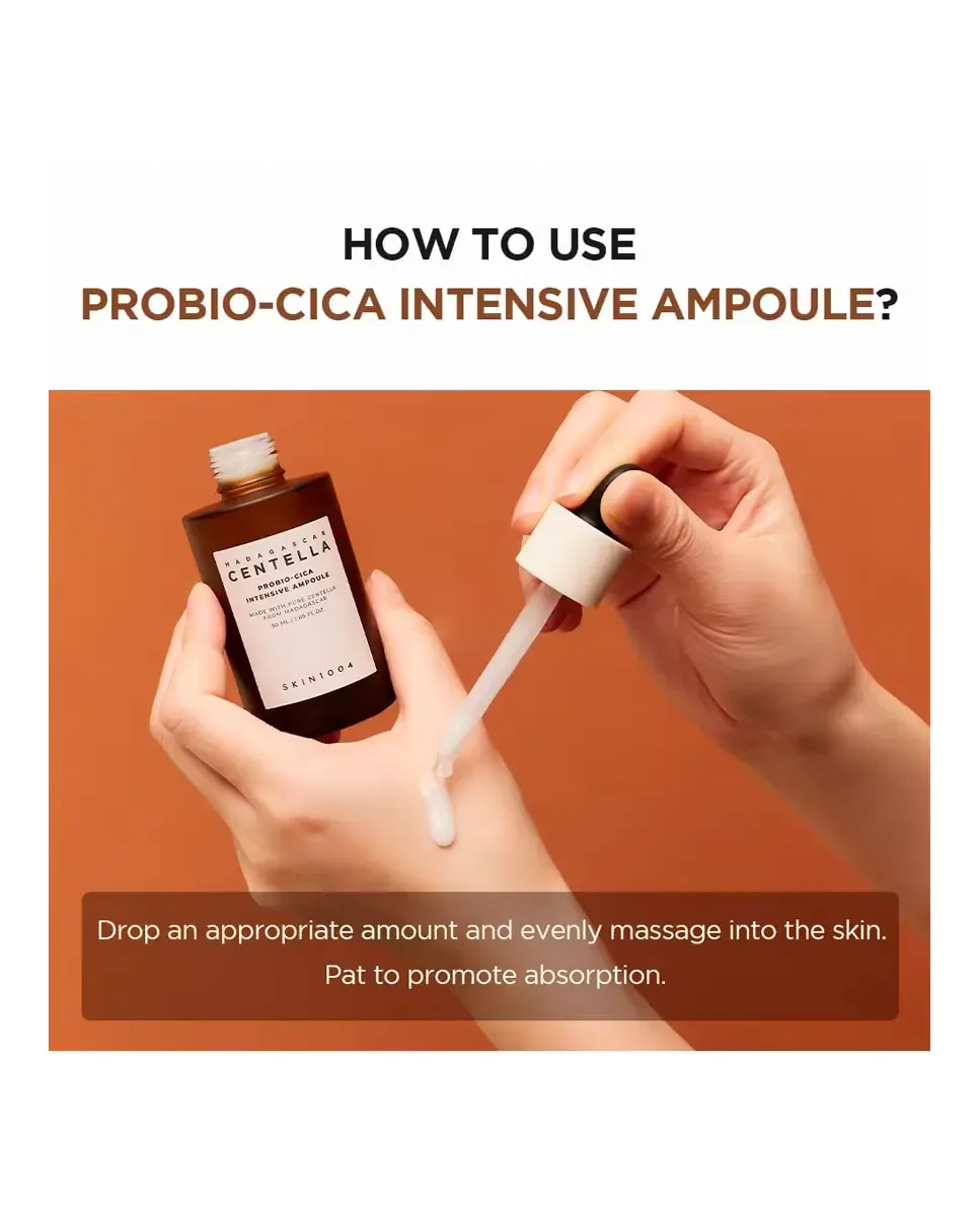 Ампула Madagascar Centella Probio-Cica Intensive от SKIN1004 - это высоко концентрированная сыворотка, которая восстанавливает, успокаивает, смягчает и омолаживает кожу. Ее формула сочетает ферментированную центеллу азиатскую с пробиотиками и TECA, обеспечивая множество преимуществ. Обеспечивает успокаивающий эффект благодаря экстракту центеллы азиатской из Мадагаскара и обеспечивает интенсивное увлажнение, балансируя уровень кожного сала. Помогает уменьшить акне и раздражение, предотвращает признаки старения, снижает видимость темных пятен и гиперпигментации, а также укрепляет кожный барьер. Подходит для всех типов кожи и может использоваться любым человеком.