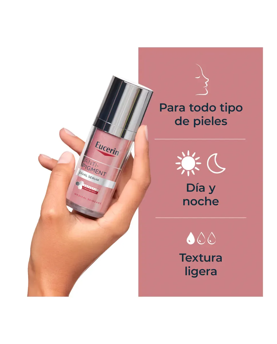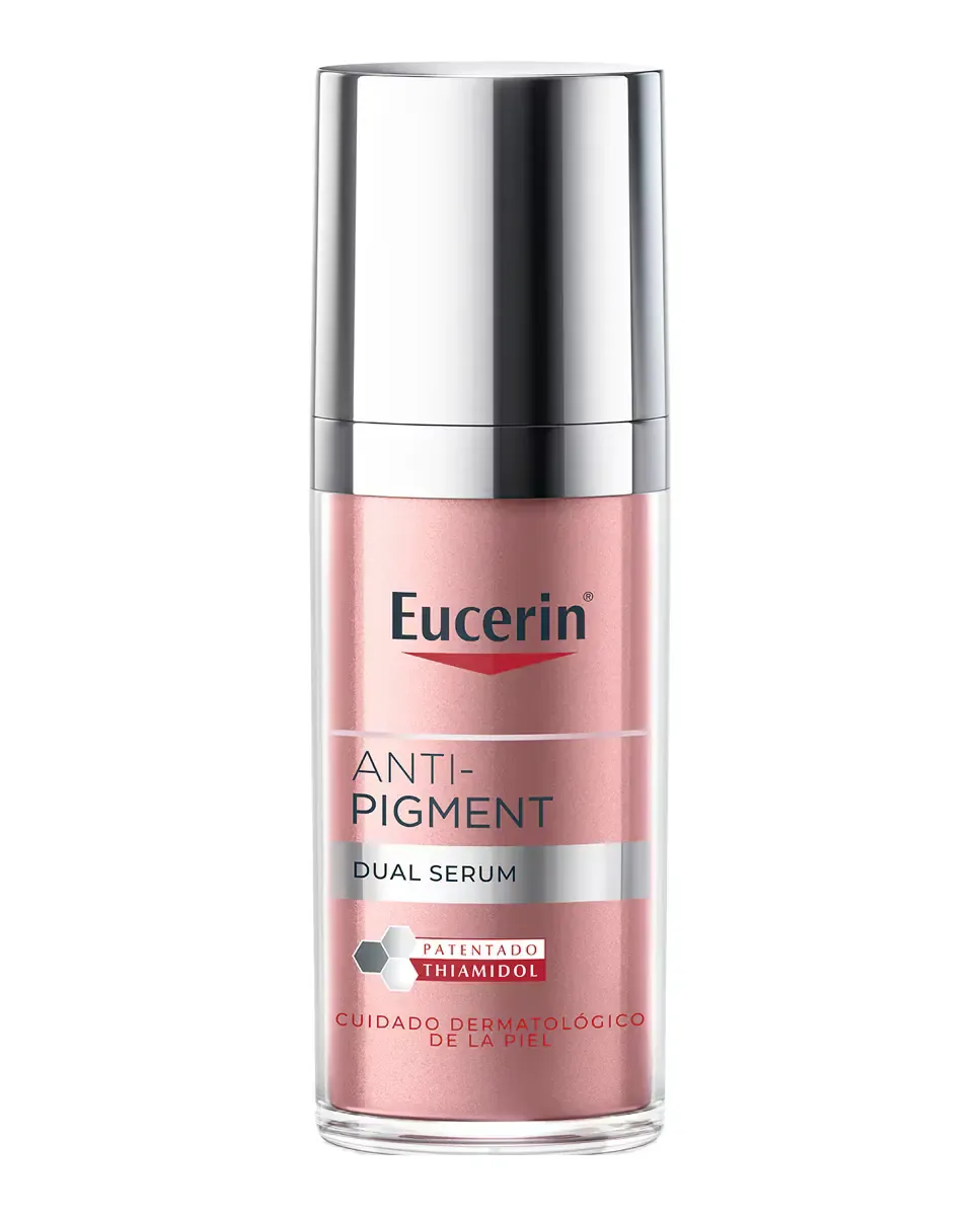 Двойной анти-пигментный сыворотка Eucerin является косметическим средством, которое борется с гиперпигментацией и улучшает внешний вид кожи. Содержит тиамидол, запатентованный ингредиент, который снижает выработку меланина с первого дня и демонстрирует видимые результаты через две недели при регулярном использовании. Включает концентрированную гиалуроновую кислоту, которая привлекает и удерживает влагу, разглаживает мимические линии и морщины, придавая коже сияние и упругость. Также содержит ликокалькон А, антиоксидант, который успокаивает кожу и защищает от солнечных повреждений. Быстро впитывается, легко наносится и не оставляет липкости. Рекомендуется ежедневное использование, как утром, так и вечером, на чистую кожу, нанося мягким массажем перед продолжением ухода за кожей.
