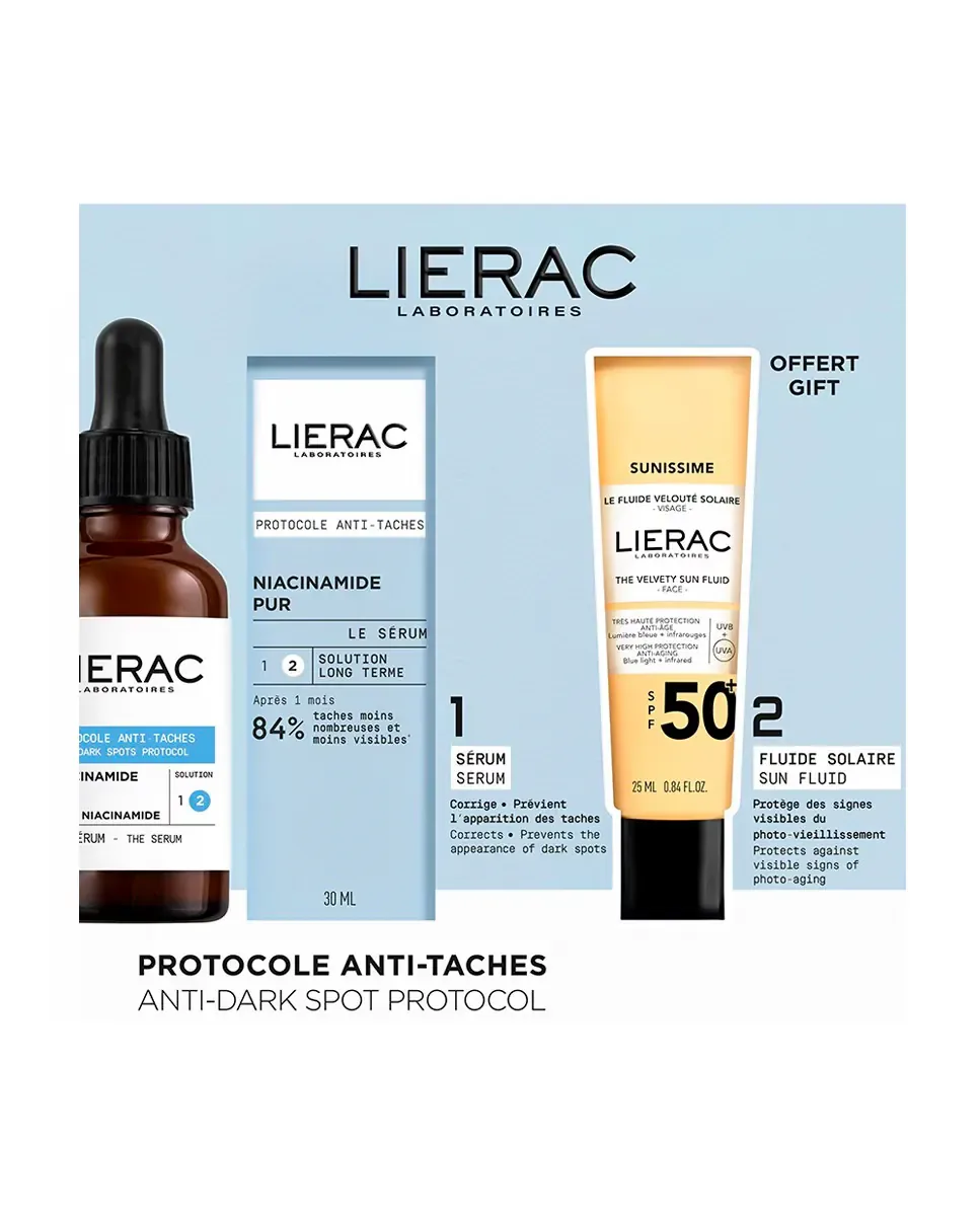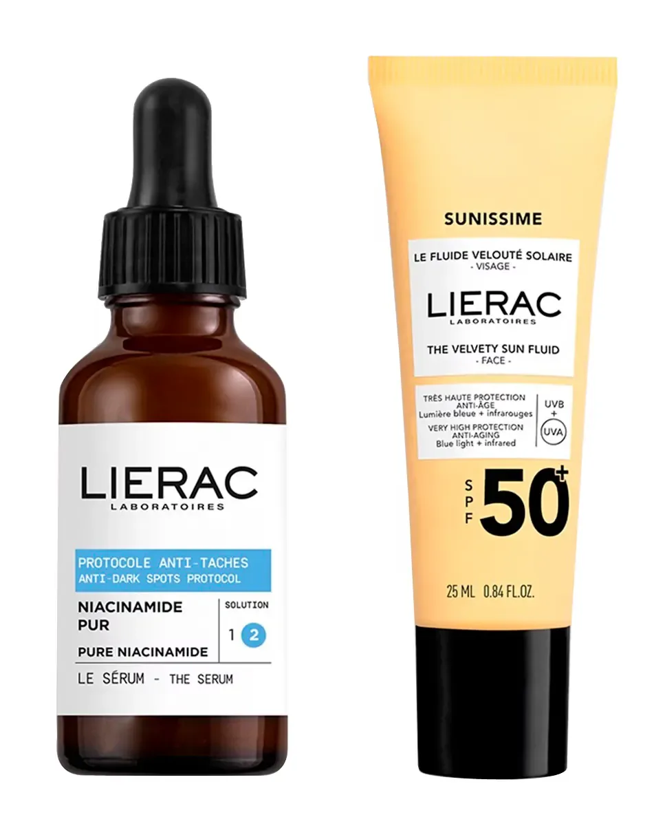 Набор Lierac Serum Antimanchas Oscuras включает Антипигментный Сыворотку объемом 30 мл и Бархатистый Солнечный Флюид SPF50 объемом 25 мл. Сыворотка разработана для коррекции и профилактики появления темных пятен на коже, с использованием чистого ниацинамида, стабилизированной витамина C и кератолитических цветочных кислот. Было показано, что 84% пользователей сообщают о видимом уменьшении пятен в первый месяц, а 96% отмечают предотвращение новых пятен после трех месяцев использования. Солнечный флюид обеспечивает очень высокую солнечную защиту и анти возрастные преимущества, защищая кожу от видимых признаков фотостарения. Его усовершенствованная формула сочетает в себе органические УФ-фильтры и активный комплекс, который защищает от синего света и инфракрасного излучения. Рекомендуется наносить сыворотку утром и вечером, а солнечный флюид щедро перед выходом на солнце, обновляя каждые два часа или после купания или потоотделения.