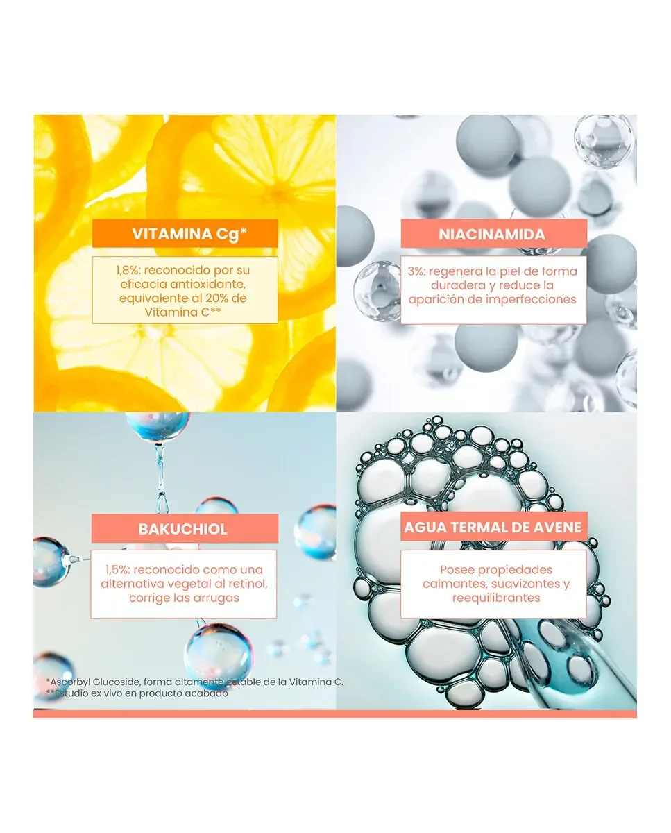Сыворотка Vitamin Act Cg от Avène - это осветляющее корректирующее средство, разработанное для чувствительной кожи. Она содержит 1,8% витамина Cg, мощного антиоксиданта; 3% ниацинамида, который помогает регенерировать кожу и уменьшать появление пигментных пятен; и 1,5% бакучиола, который действует как растительная альтернатива ретинолу для коррекции морщин. Эта сыворотка обеспечивает мгновенное сияние, оставляя кожу сияющей с первого применения. При регулярном использовании заметно, что уже через 15 дней кожа разглаживается и наполняется на 95%, а через месяц уменьшаются пигментные пятна. Она содержит 94% ингредиентов природного происхождения и не включает ингредиенты животного происхождения. Продукт представлен в стеклянной бутылочке с пипеткой для удобного применения. Его преимущества включают коррекцию морщин, уменьшение темных пятен и выравнивание тона кожи.