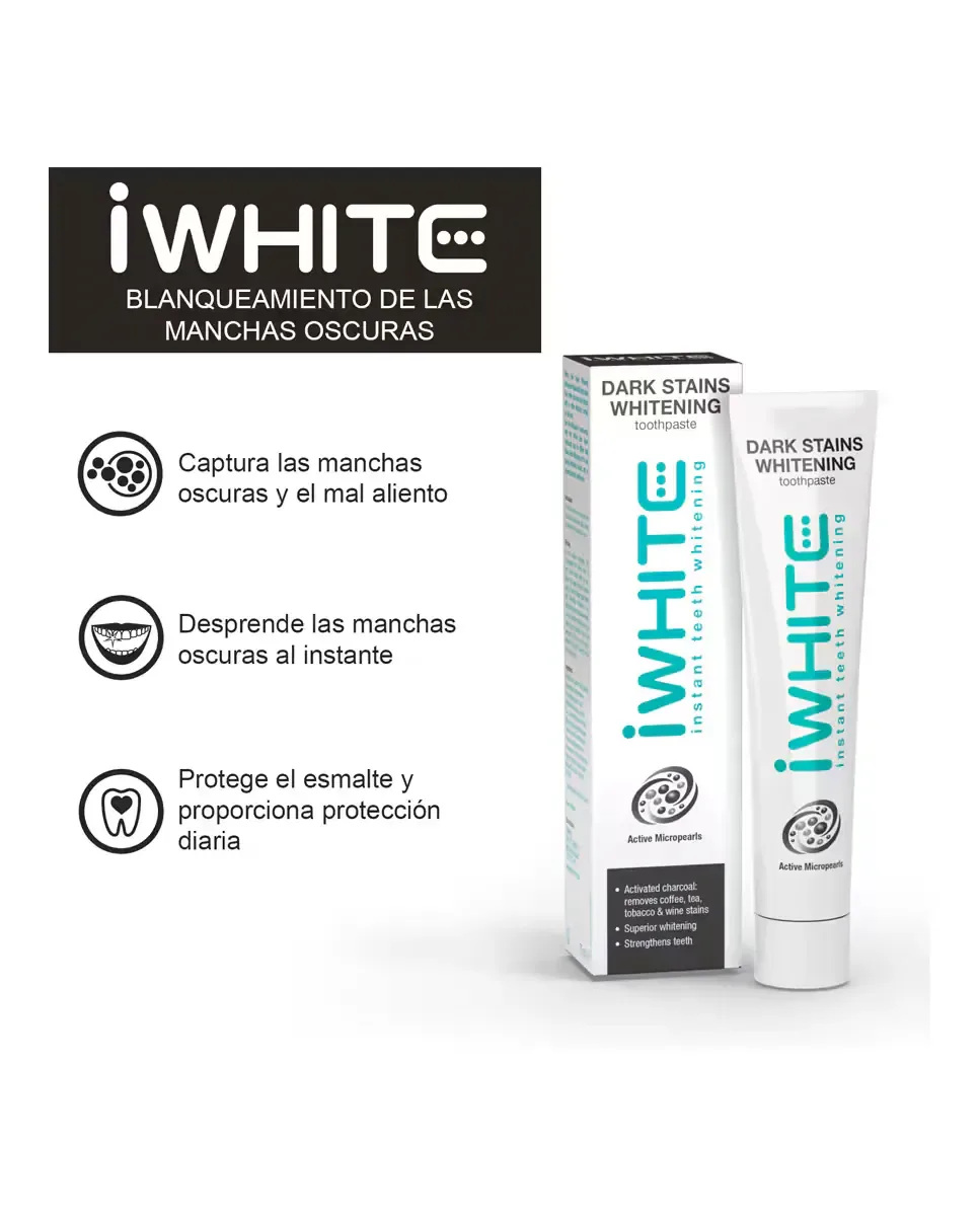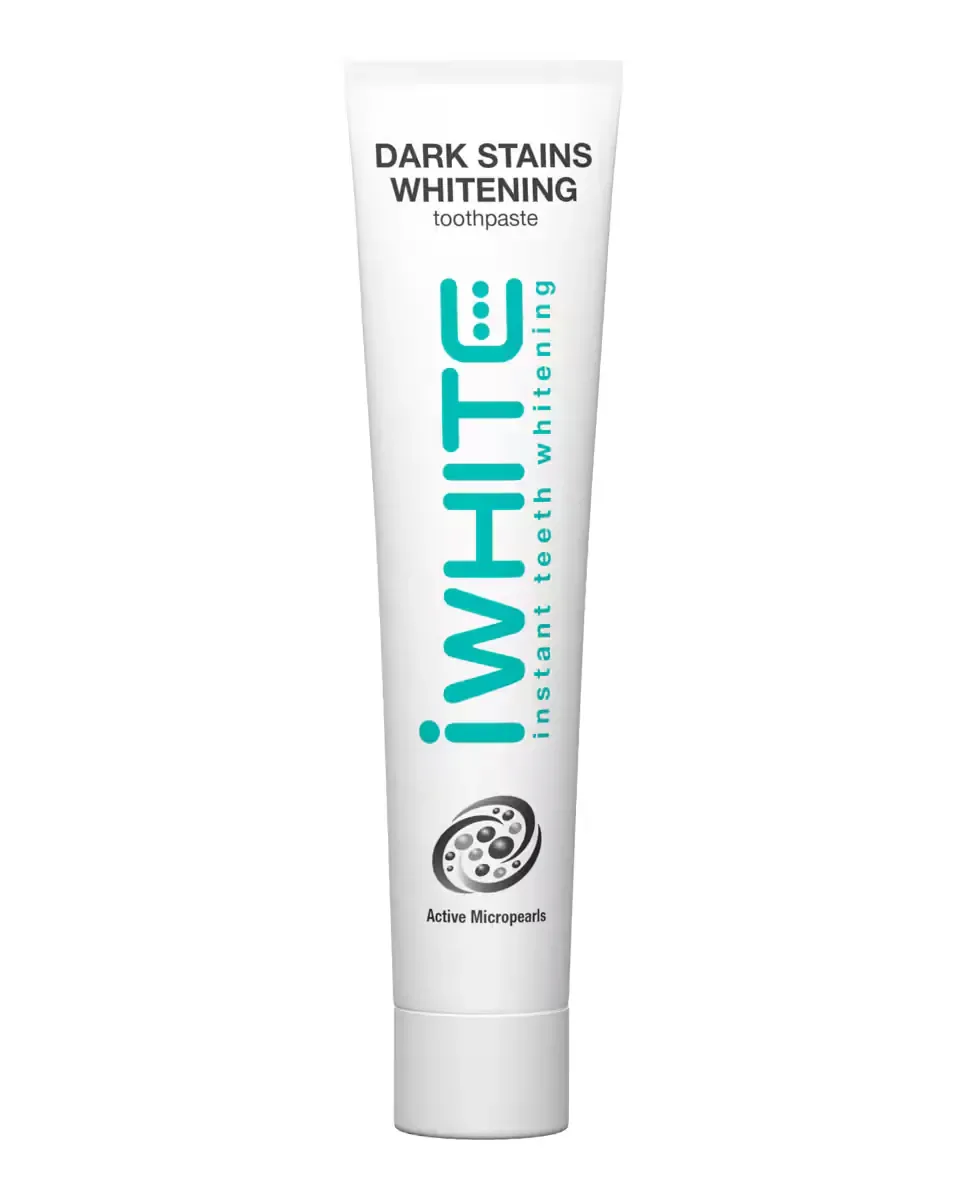 Зубная паста iWhite для темных пятен разработана для удаления пятен, вызванных кофе, чаем, табаком и вином. Этот продукт предотвращает появление новых пятен благодаря своему компоненту PAP, который обеспечивает отбеливание. Она также помогает освежить дыхание, предоставляя ощущение чистоты. Рекомендуется использовать как минимум дважды в день для поддержания надлежащей гигиены полости рта.