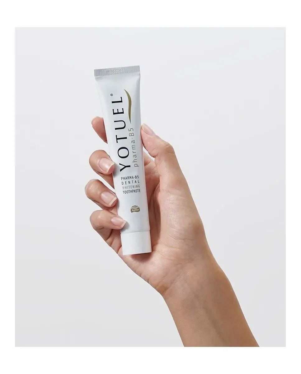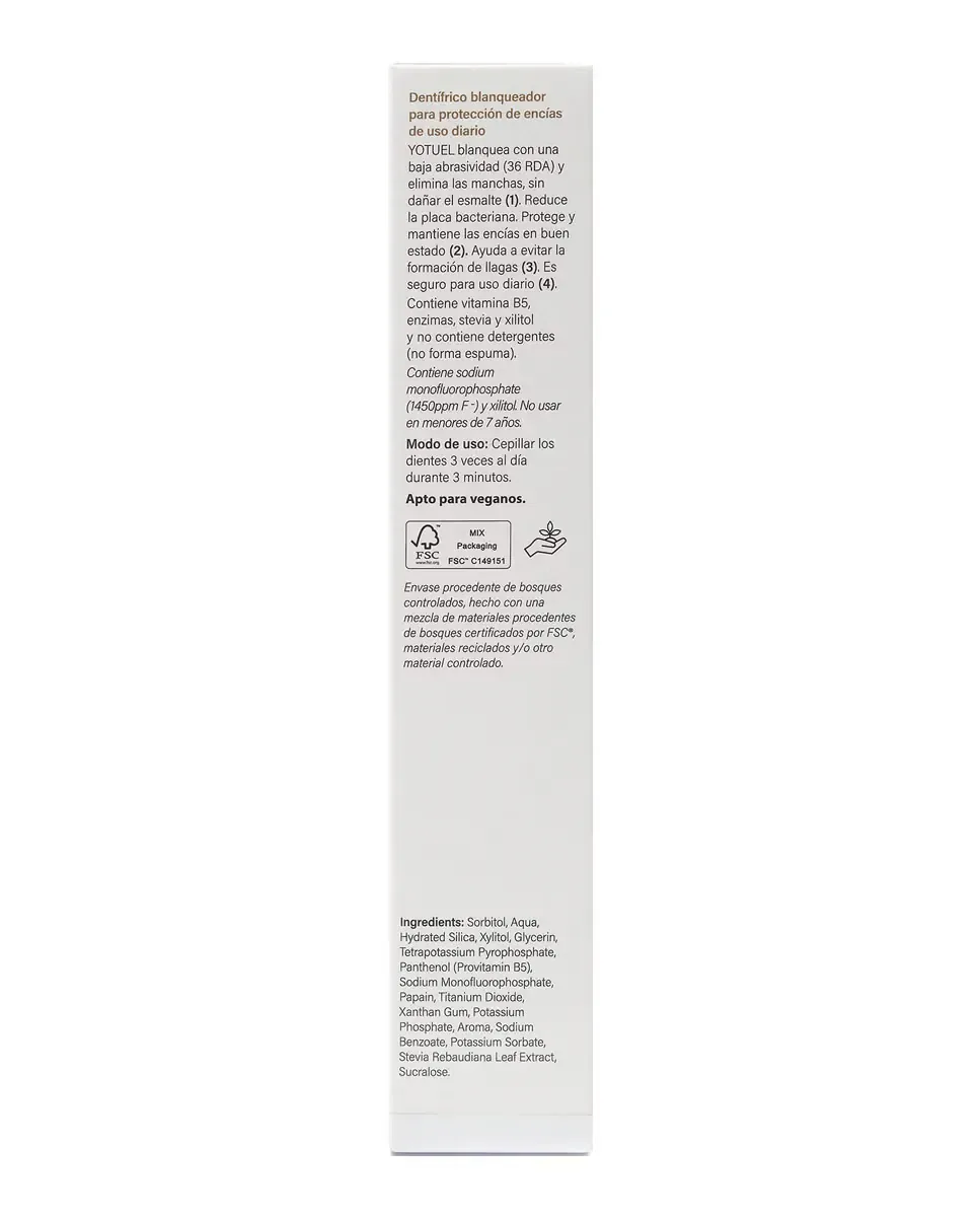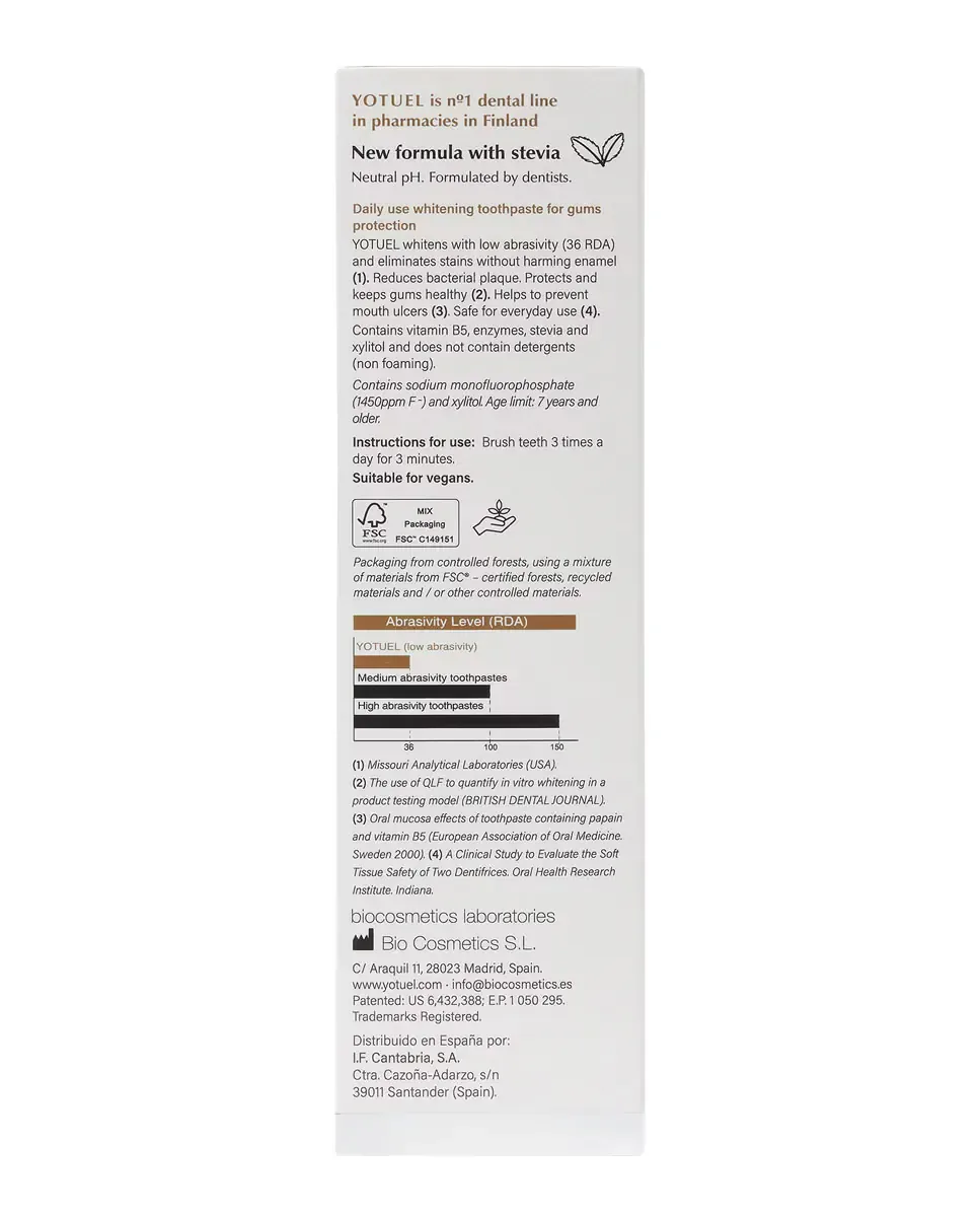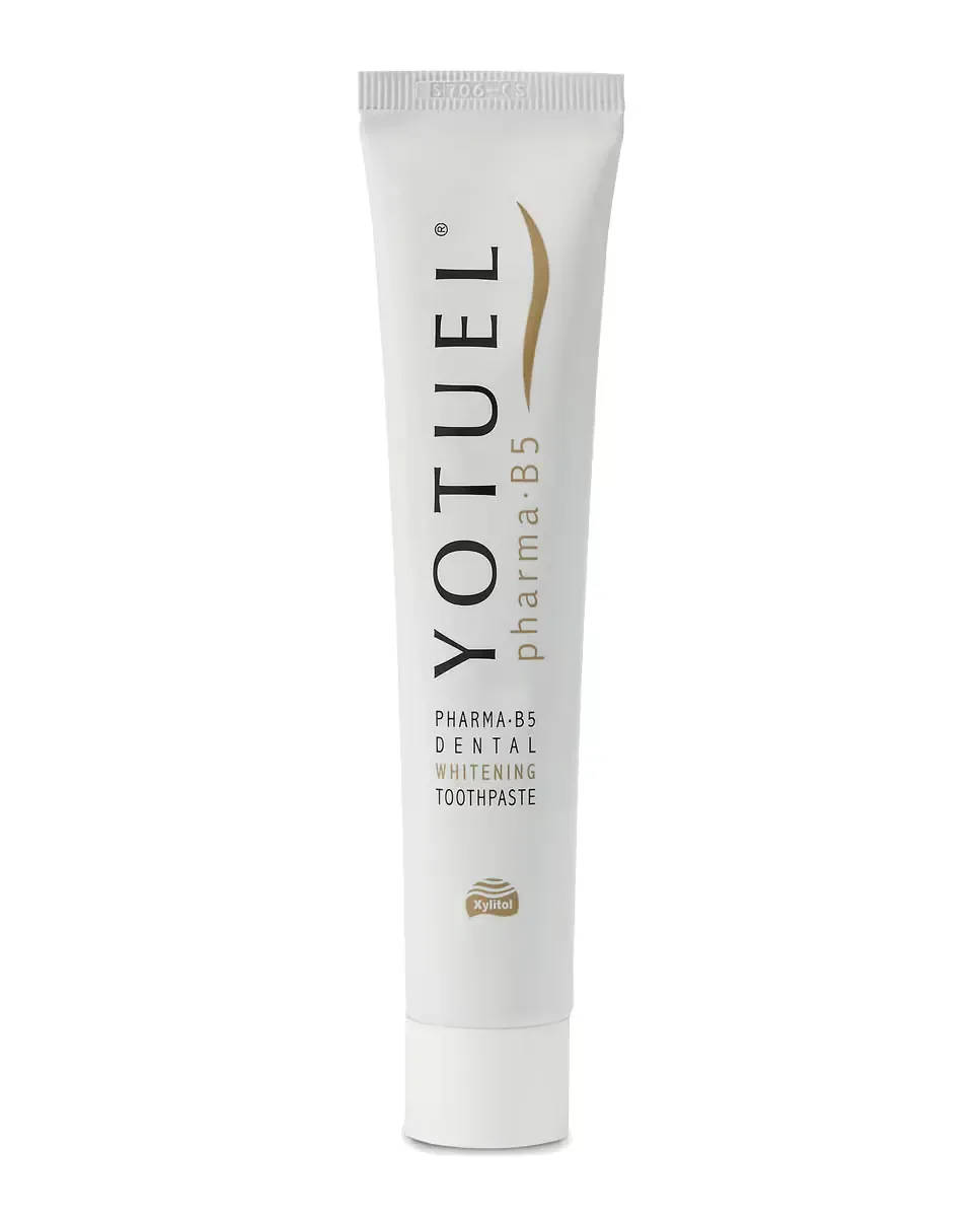 Yotuel Farma B5 - это отбеливающая зубная паста для ежедневного использования, разработанная для отбеливания зубов без повреждения зубной эмали. Она заменяет традиционные абразивы на натуральные ферменты и ксилит, что делает ее более мягким и эффективным вариантом. Не содержит лаурилсульфат натрия, что делает ее подходящей для более деликатной гигиены полости рта. Имеет индекс абразивности 36 RDA, что ставит ее среди отбеливающих зубных паст с наименьшей абразивностью на рынке. Формула с нейтральным pH делает ее идеальной для чувствительных десен. Содержит витамин B5, который оказывает регенерирующее и противовоспалительное действие, способствуя заживлению повреждений во рту. Эффективна против налета, зубного камня и кариеса благодаря высокому содержанию ксилита и фтора, включая фторид натрия в концентрации 1450 ppm F. Рекомендуется для использования взрослыми и не должна использоваться детьми до 7 лет. Имеет вкус лакрицы.