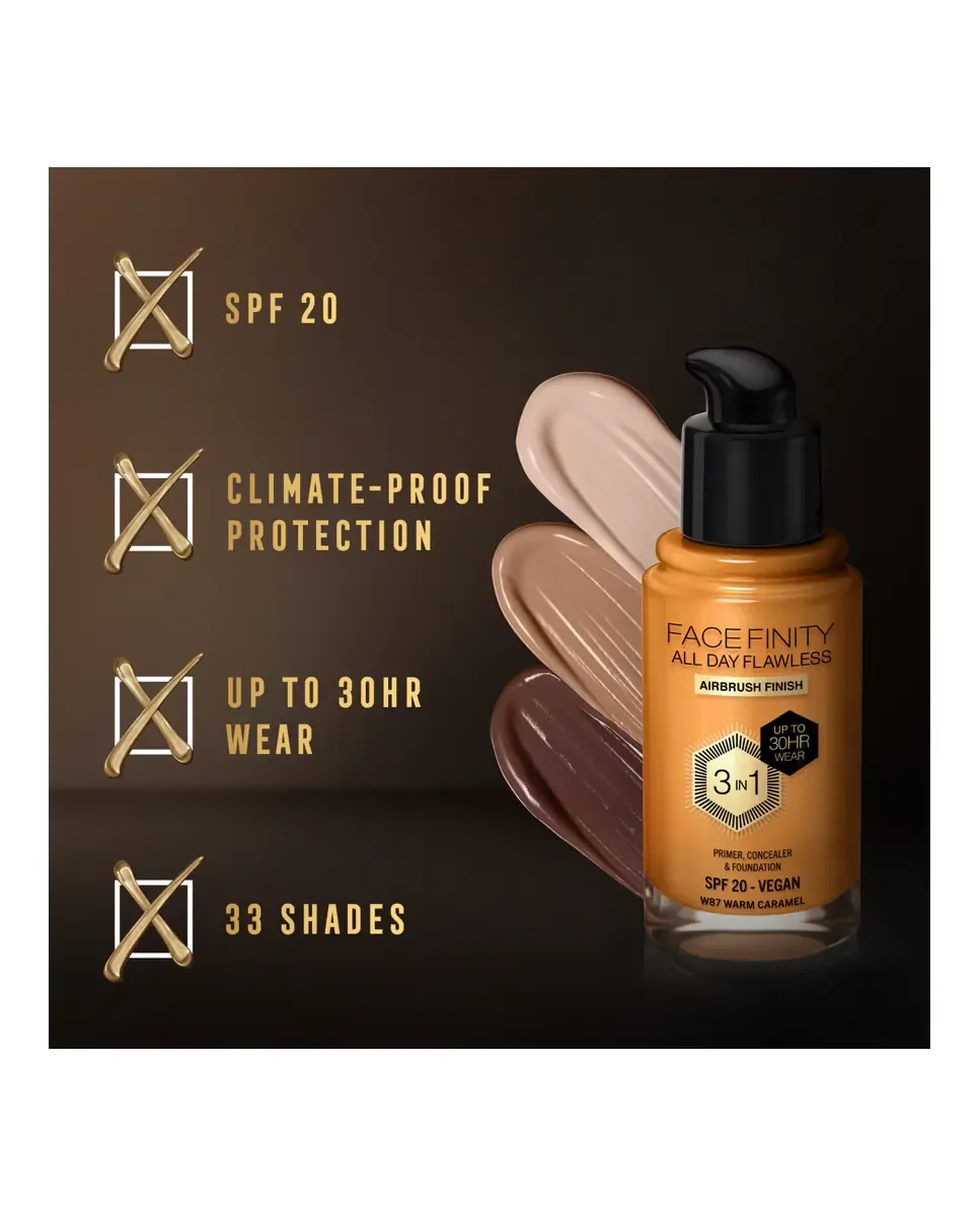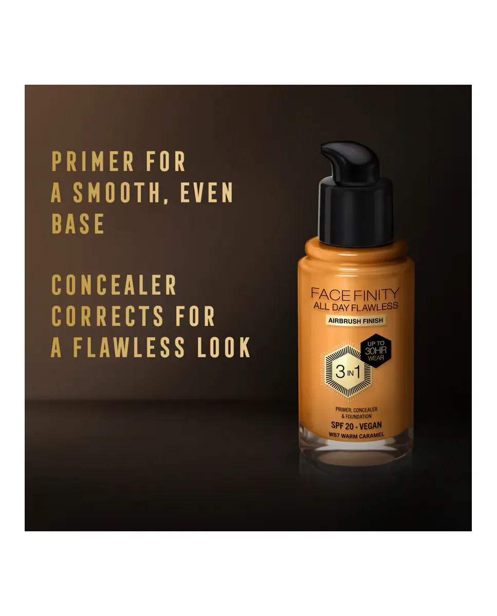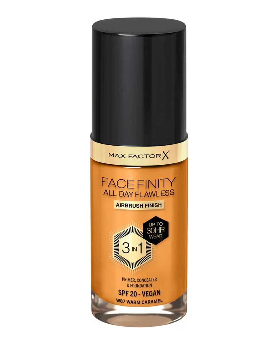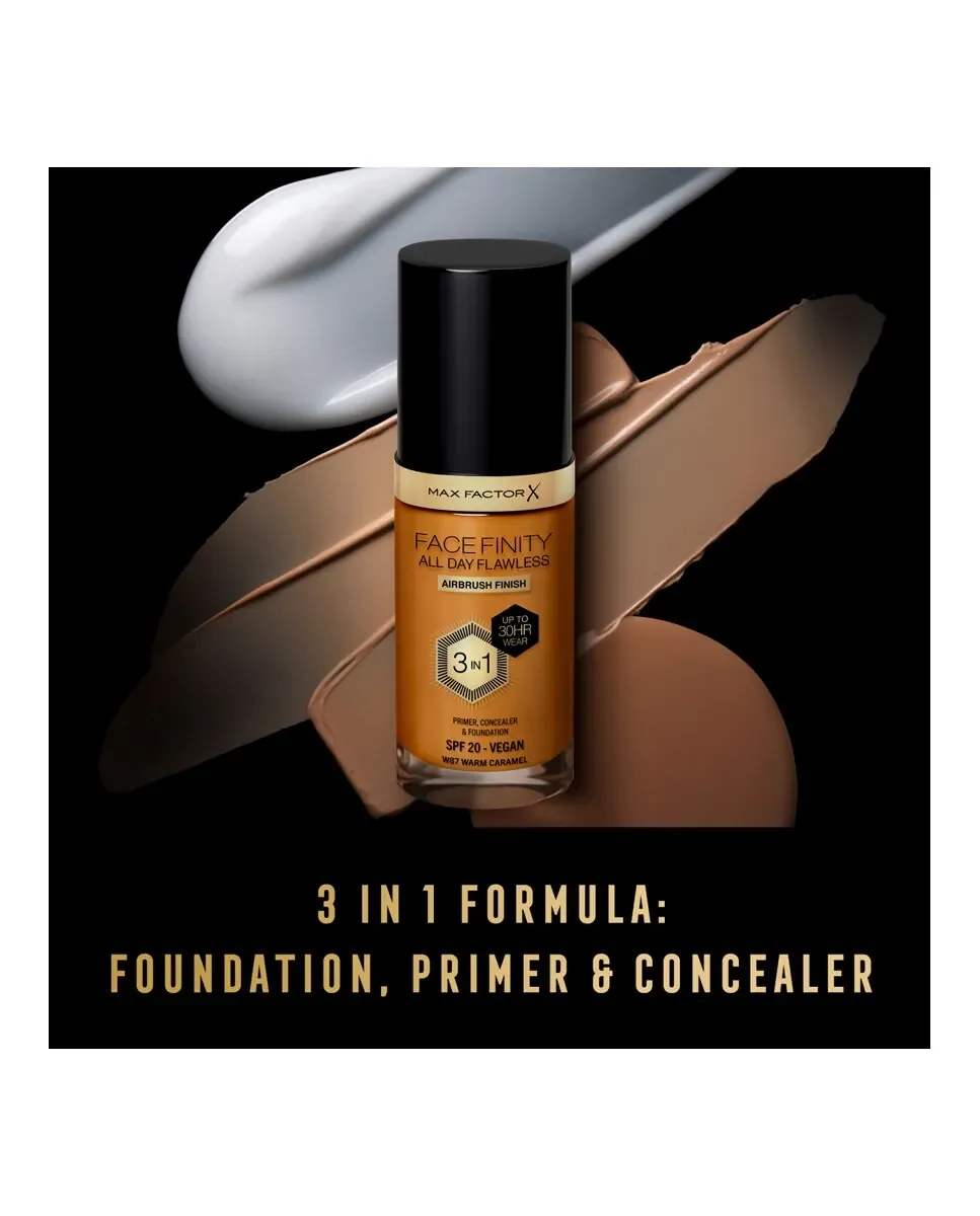 Max Factor Facefinity All Day Flawless 3 в 1 - это жидкая тональная основа с включенной праймер-базой и консилером для долговечного и безупречного покрытия.