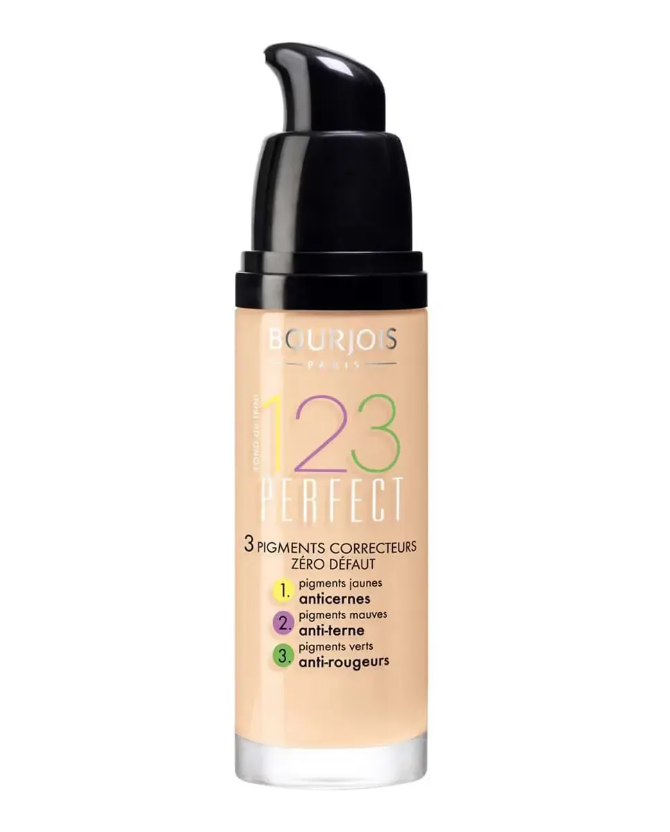 Тональная основа 1, 2, 3 Perfect от Bourjois разработана для обеспечения среднего покрытия, которое можно усилить, не оставляя эффекта маски. Ее формула сочетает три типа корректирующих пигментов: желтые пигменты, скрывающие темные круги под глазами, фиолетовые пигменты, освещающие тусклую кожу, и зеленые пигменты, нейтрализующие покраснения, выравнивая тон кожи. Обеспечивает полуматовый финиш, который освещает тусклую кожу, и разработана так, чтобы держаться в течение дня. Может наноситься пальцами для естественного эффекта или с помощью спонжа для более гламурного образа.