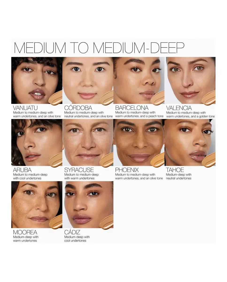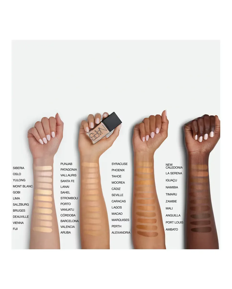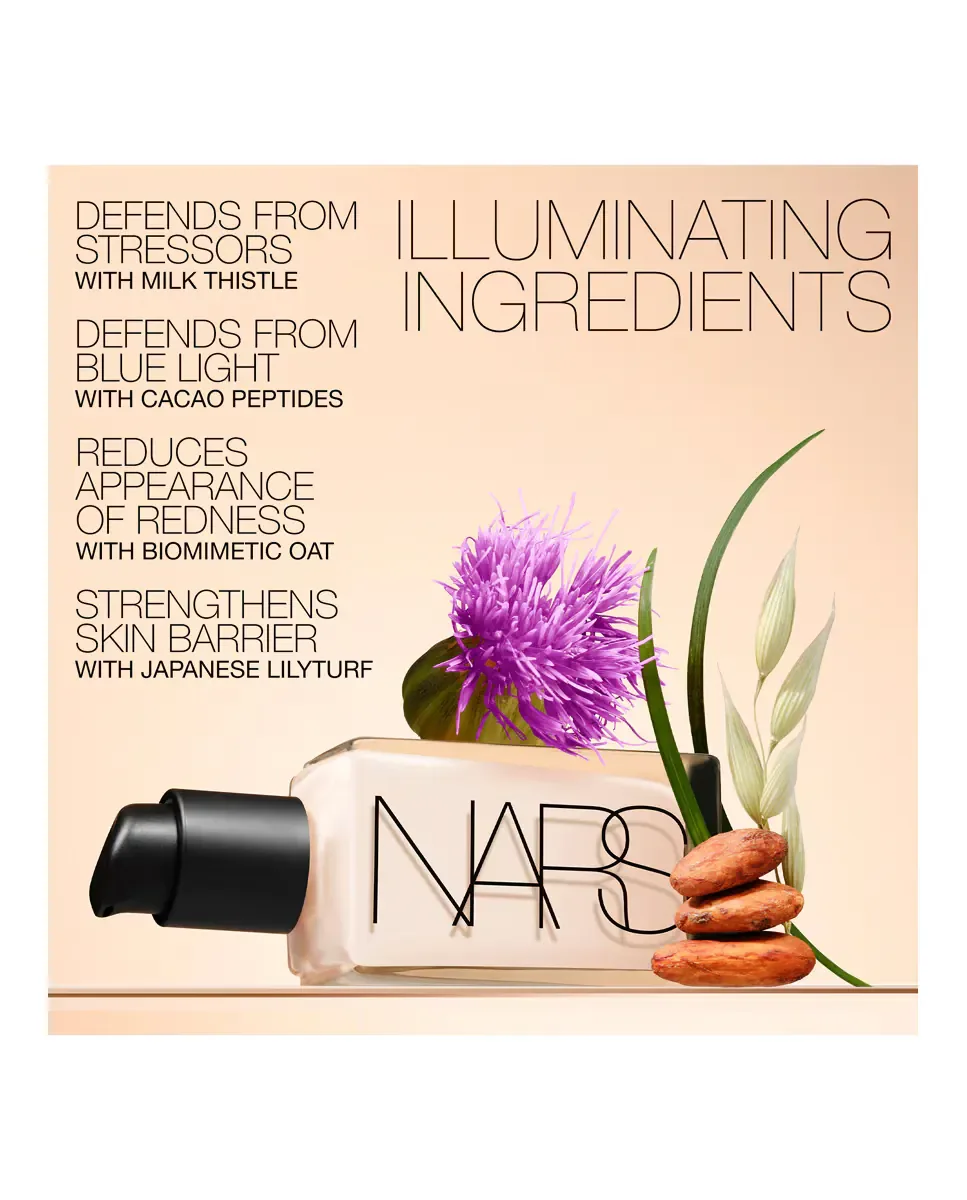 Основа под макияж Light Reflecting Skin Foundation от NARS - это продукт, который сочетает в себе макияж и уход. Обеспечивает среднее и настраиваемое покрытие, подходит для всех типов кожи, включая наиболее чувствительную. Его жидкая формула маскирует несовершенства, выравнивает текстуру кожи и скрывает прыщи, черные точки и покраснения. При ежедневном использовании заметно улучшает сияние кожи и защищает от воздействия окружающей среды и синего света. Включает фотохромную технологию, которая подстраивает тон кожи в зависимости от интенсивности света, предотвращая нежелательный блеск. Его комплекс Light Reflecting Complex сочетает микропризмы, активирующие свет, с экстрактом водорослей и морской водой Полинезии, оптимизируя отражение света и усиливая сияние кожи. Формула веганская, неккомедогенная и позволяет коже дышать, оставаясь свежей в течение всего дня.