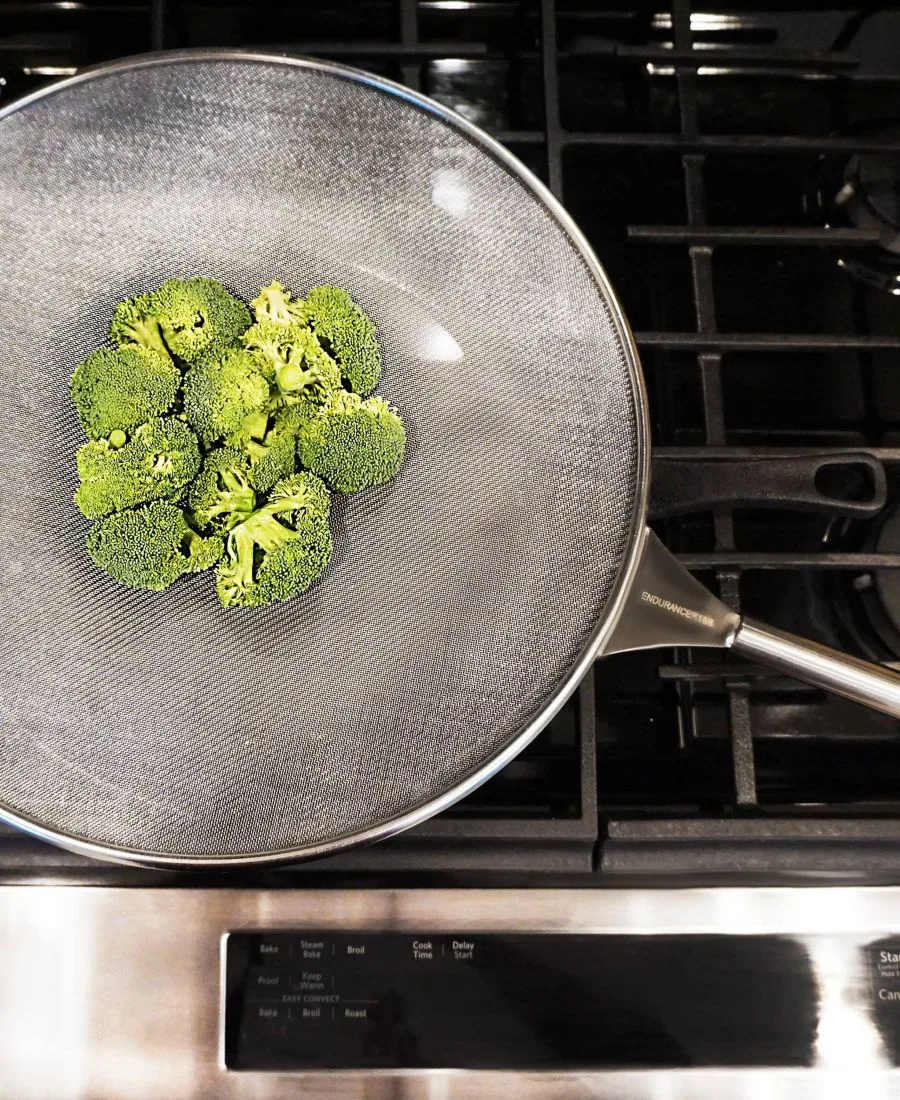 Защитный экран от брызг Endurance из нержавеющей стали 18-8 подходит для больших кастрюль, сковородок и воков диаметром до 38 см. Двойная сетка с мелкими ячейками удерживает горячие брызги внутри кастрюли, предотвращая попадание жира на кухню и плиту, а также защищая вас от ожогов во время готовки.